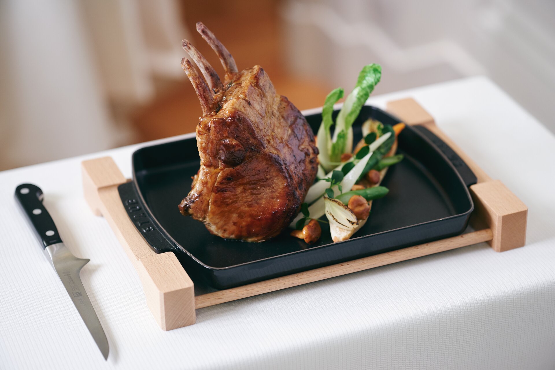 Diese rechteckigen Auflauffomen mit Holzunterlage aus der Serie Staub Accessories können Sie verwenden, um am Tisch warme Speisen zu servieren, ohne dass der heiße Tellerboden den Tisch beschädigt.