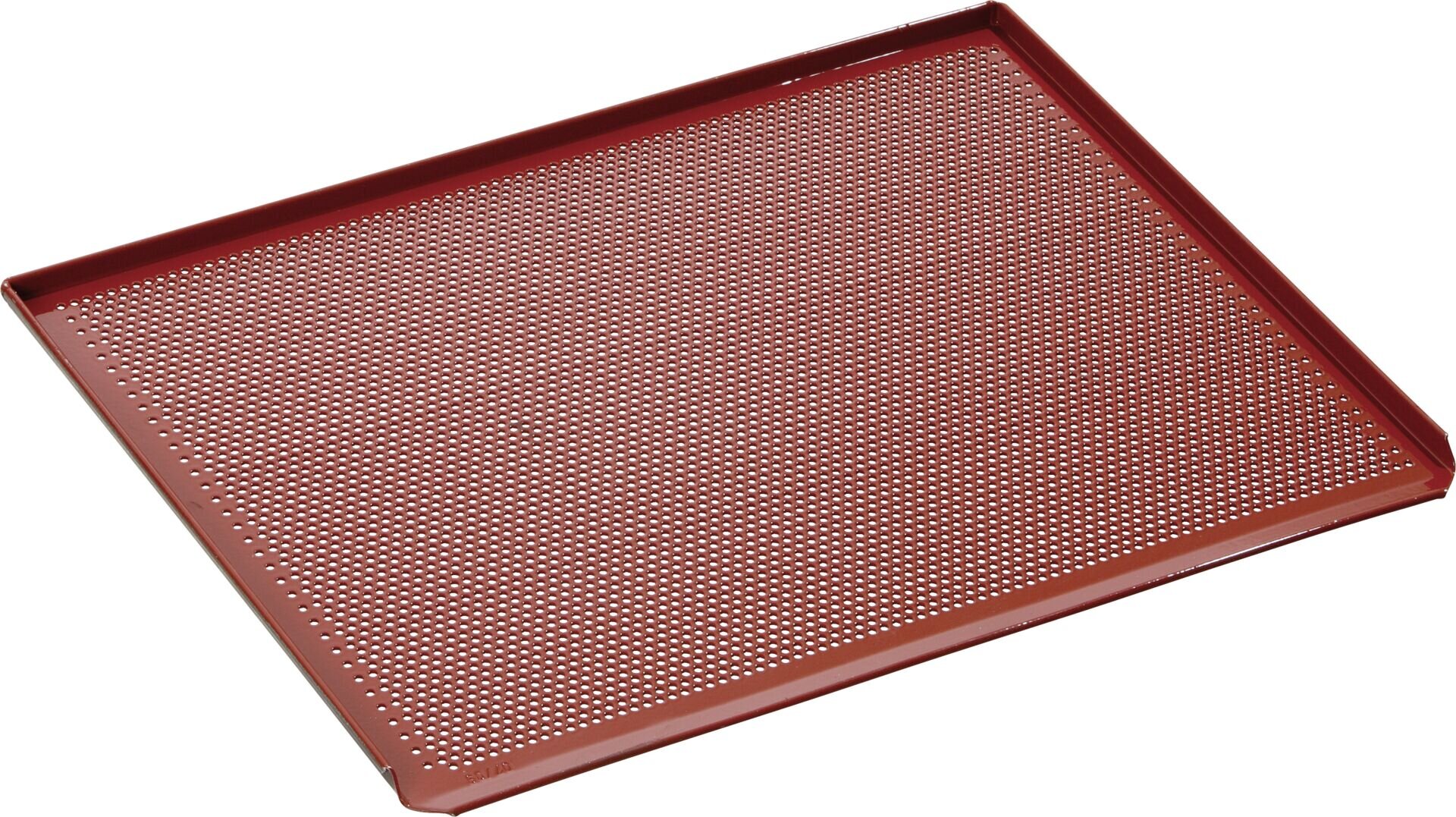 LxBxH in cm: 43,3x33x1 Aluminium. Silikonbeschichtet. Mit Lochung 3 mm. Mit 3 Seiten Rand. Materialstärke: 1,5 mm.