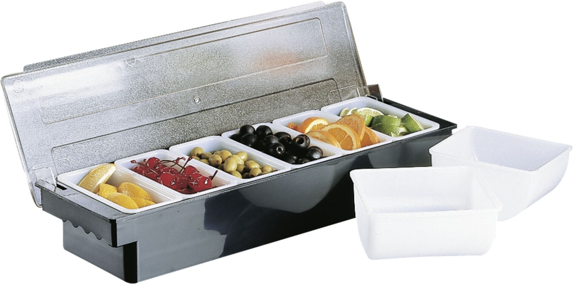 Kunststoff, schwarz. Deckel, transparent. spülmaschinengeeignet. 6 Fächer à 440 ml. Mit herausnehmbaren Fächern. Zum Aufbewahren und Frischhalten Ihrer Cocktailgarnierungen: Die schwarze Box wird mit Crushed-Ice gefüllt und hält dadurch die Lebensmittel länger frisch. Zwei seitliche Griffmulden für den leichten Transport, kann über Nacht in die Kühlung gestellt werden. Mit massivem Klapp-Deckel.