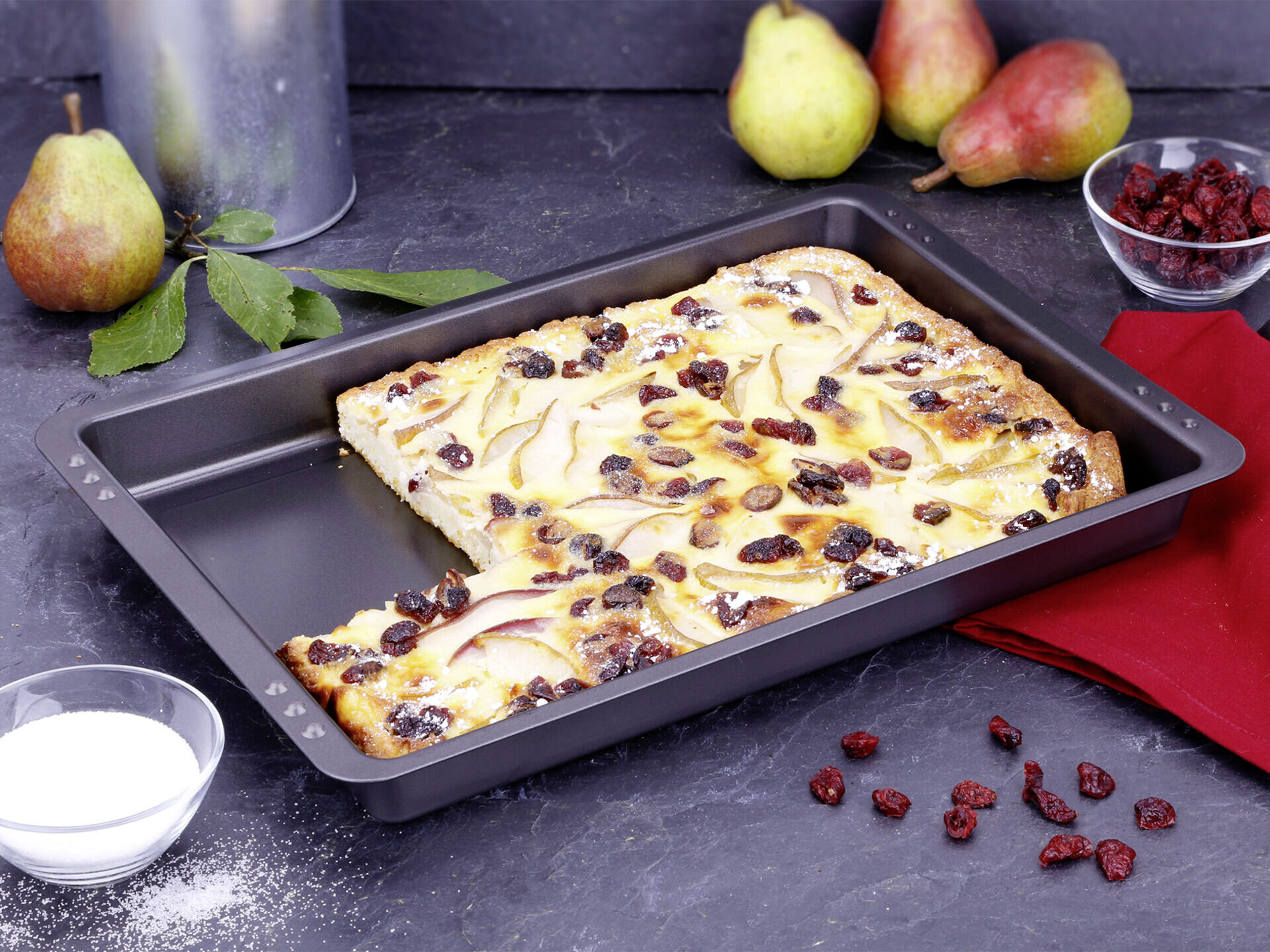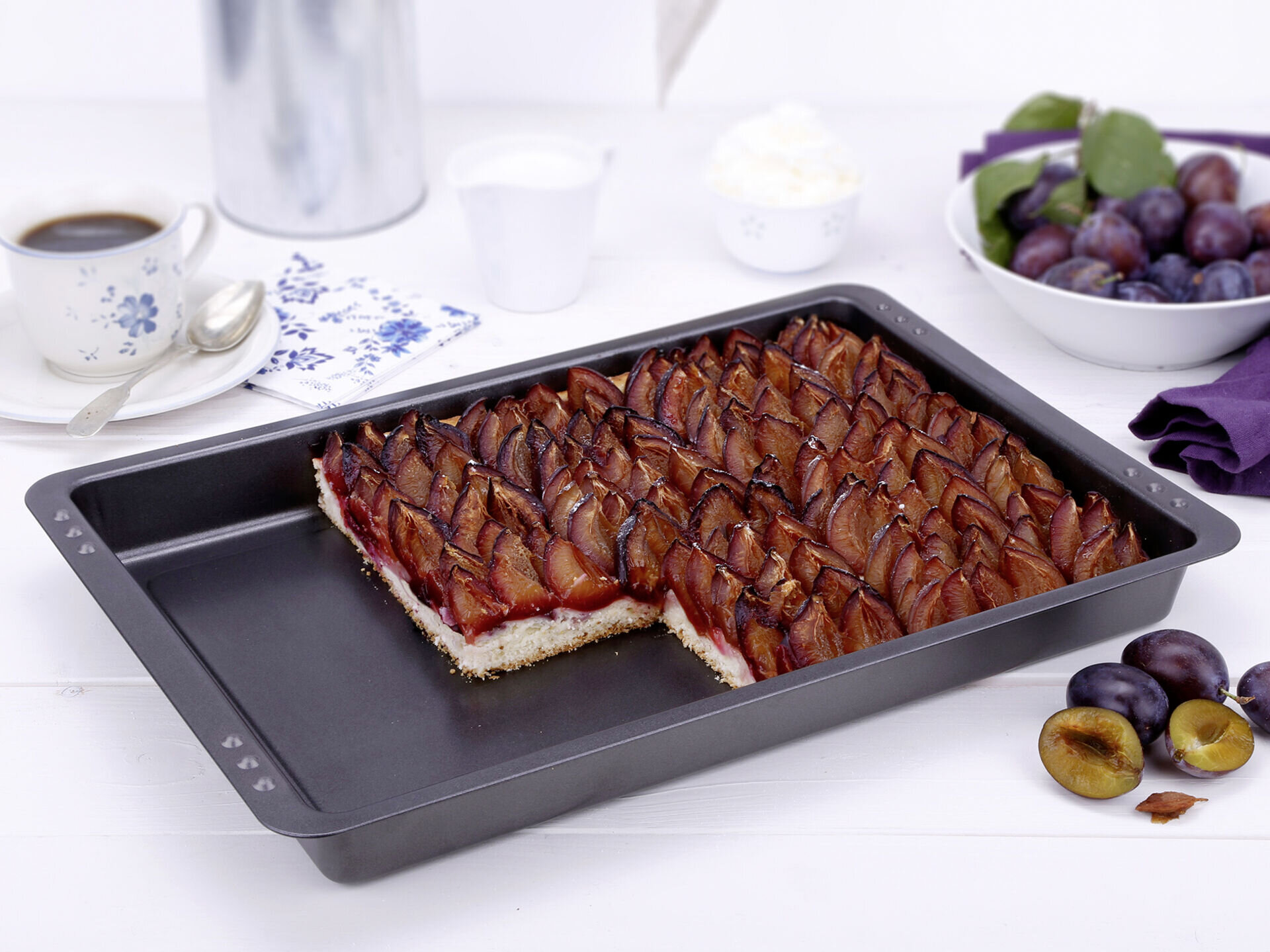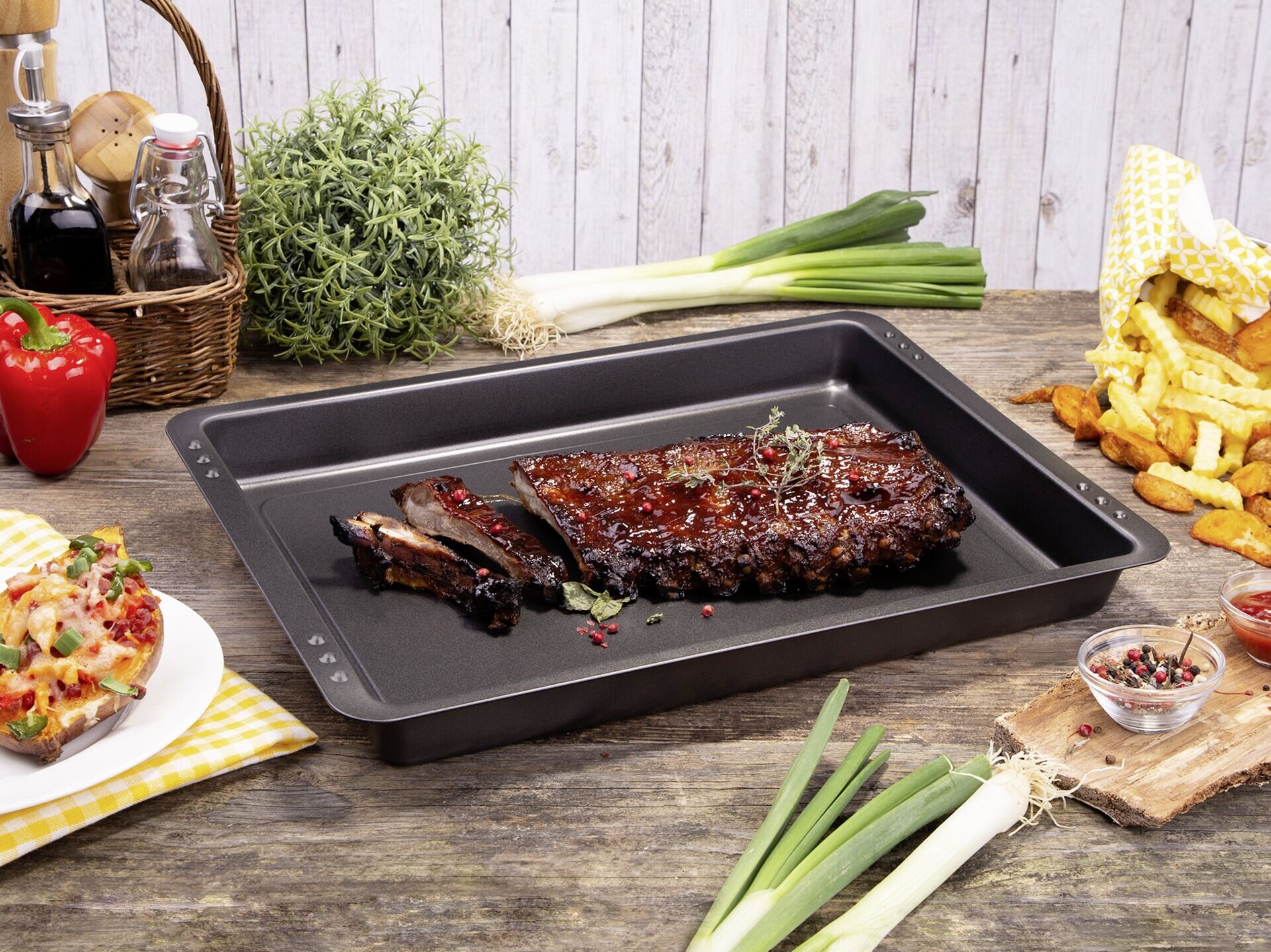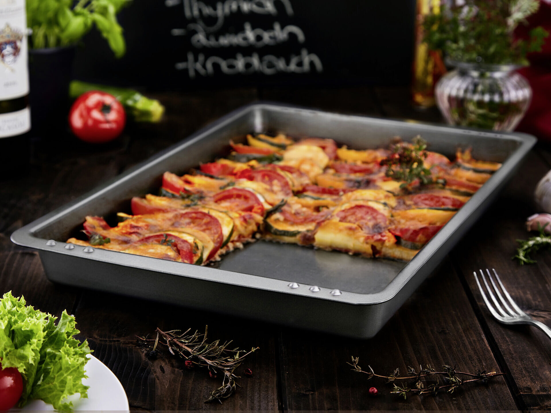LxBxH in cm: 42,0x29,0x4,0 Made in Germany. ILAG Antihaftbeschichtung - Zweischicht-System, bis 250°C hitzebeständig, extra tief, mit seitlichen Arretierungspunkten, um eine zweite Form als Deckel verwenden zu können, Farbe: anthrazit-metallic.