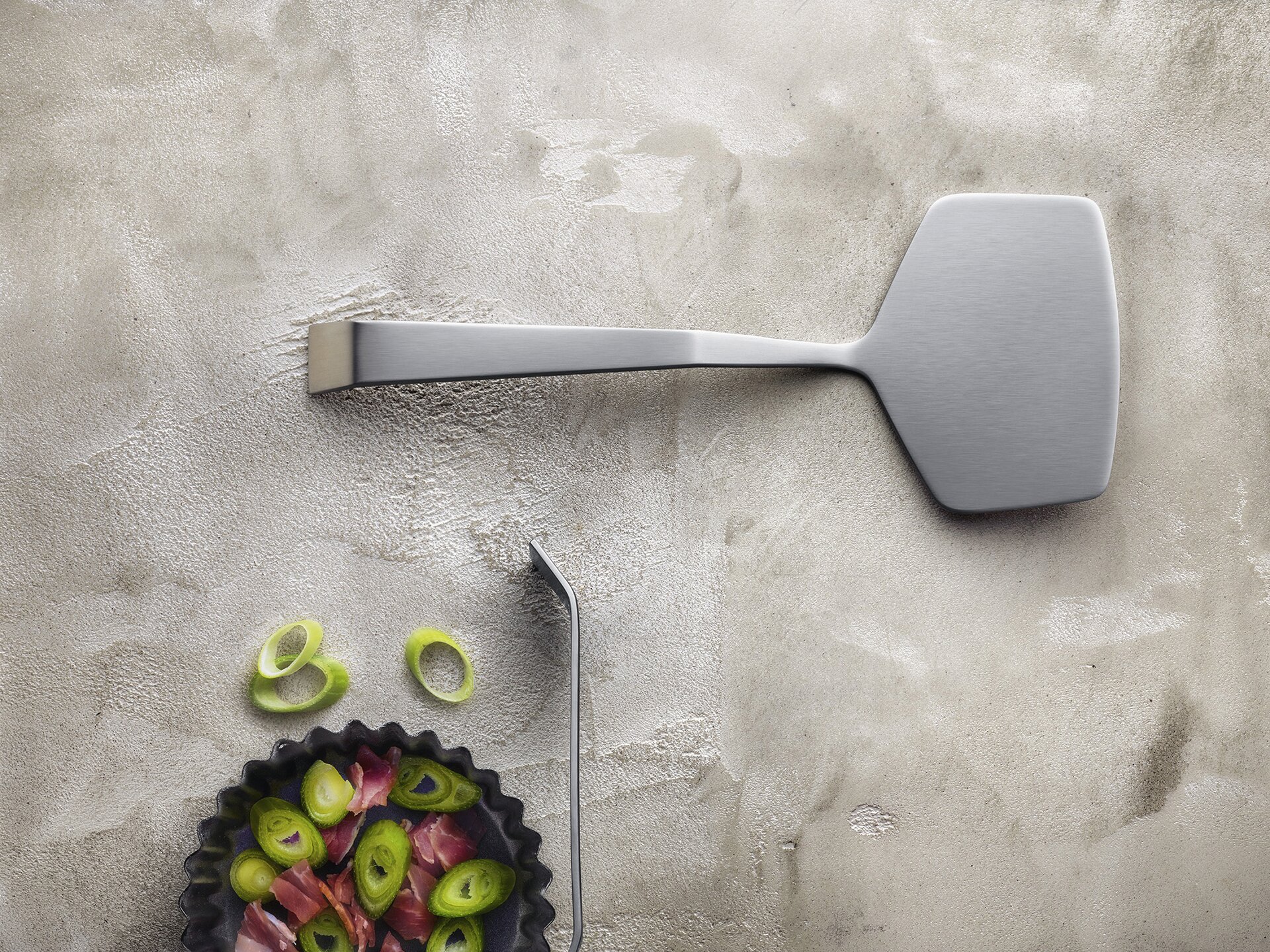 Kulinarische Veränderungen erfordern auch eine Erneuerung des Buffets. Dies war der Anlass für die gemeinsame Entwicklung der Serie "Buffet Selection - 1309" zwischen Amefa und dem Designer Carsten Gollnick. Der Paté und Antipasti Heber ist eine Weiterentwicklung des klassischen Wenders. Der Trend hin zum Servieren von Antipasti, Pasteten und Quiches gaben die Inspiration für dieses besondere Produkt. Der Stil des Hebers ist kürzer als von gewöhnlichen Servierteilen. Dies stellt eine gewisse Nähe zum Lebensmittel her.