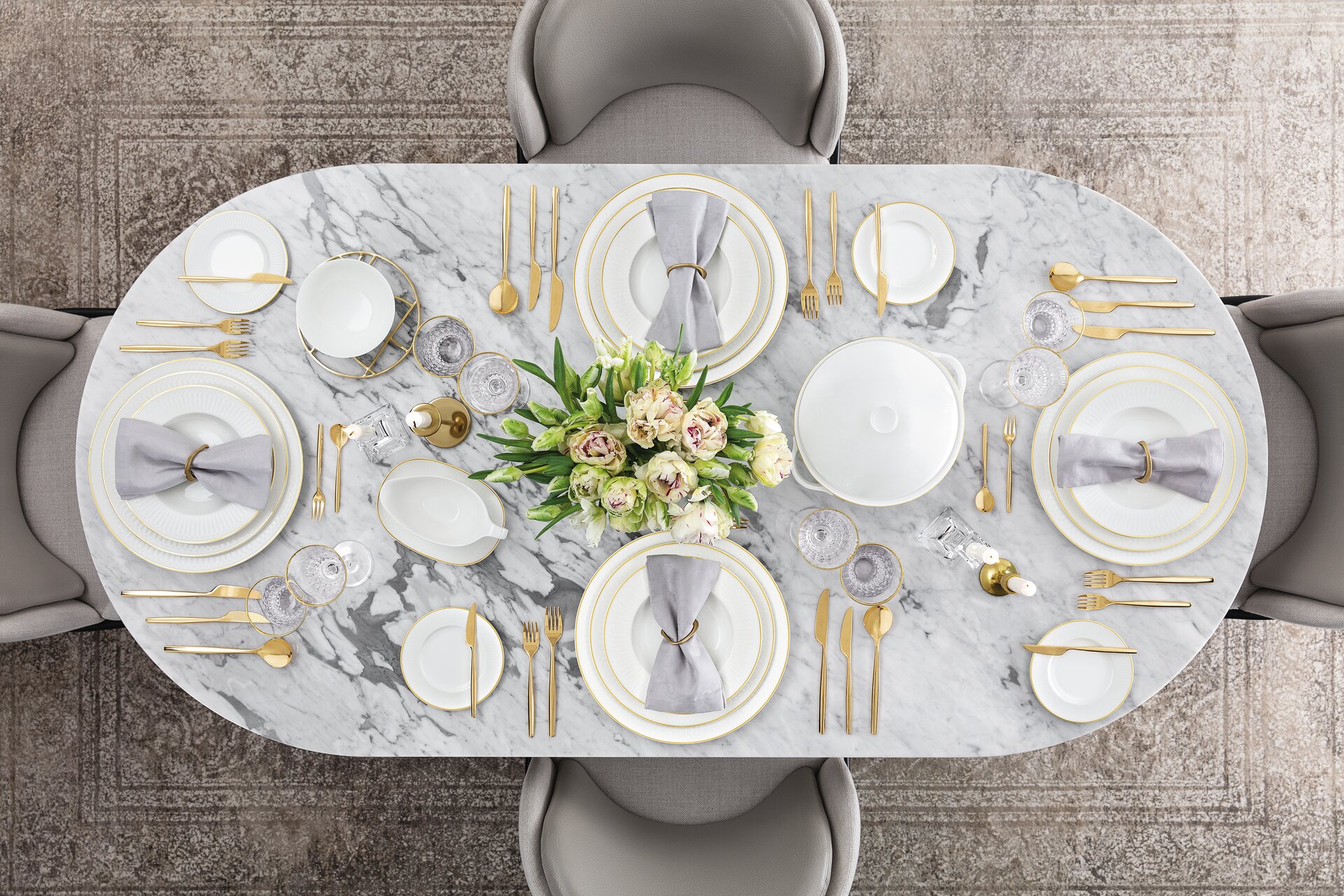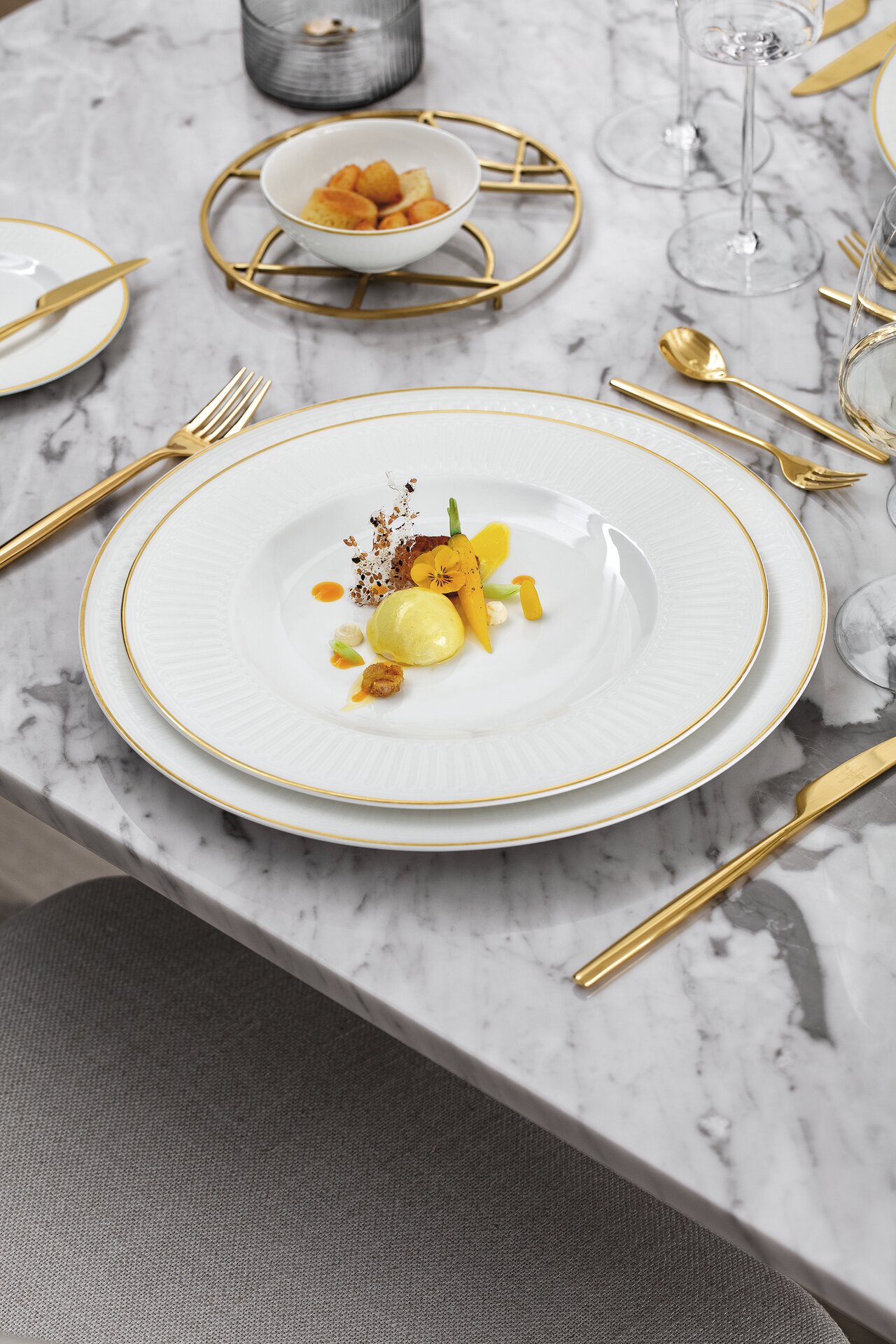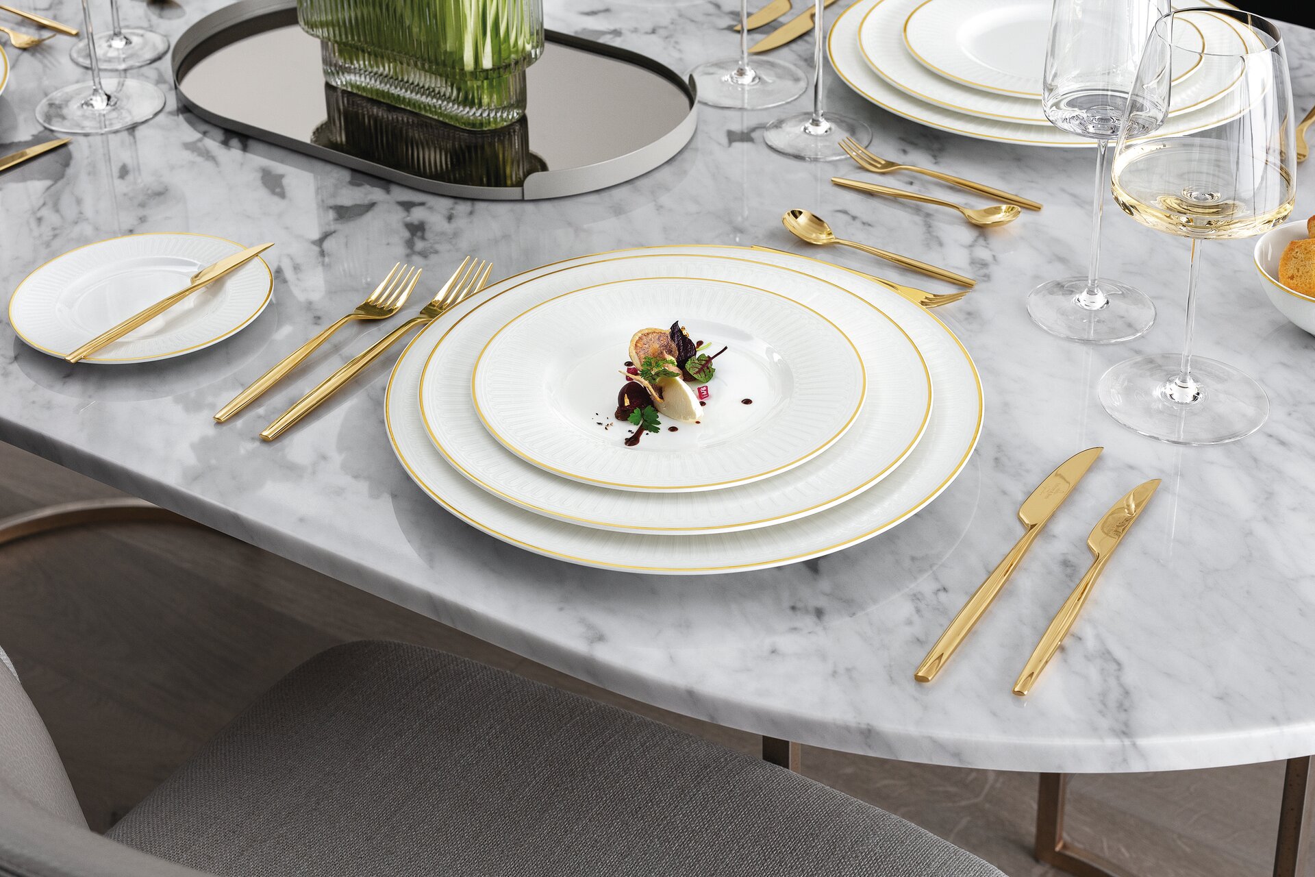 Château Septfontaines gelingt es, klassisches Art Déco-Design mit moderner Opulenz zu verbinden. Das einzigartige Relief entsteht durch eine eigens entwickelte innovative Dekortechnik. Zusammen mit moderner matter Optik auf Premium Bone Porcelain und feinstem Inglasur Goldfilet wurde eine Premium-Kollektion erschaffen, die selbst die anspruchsvollsten Kunden beeindruckt.