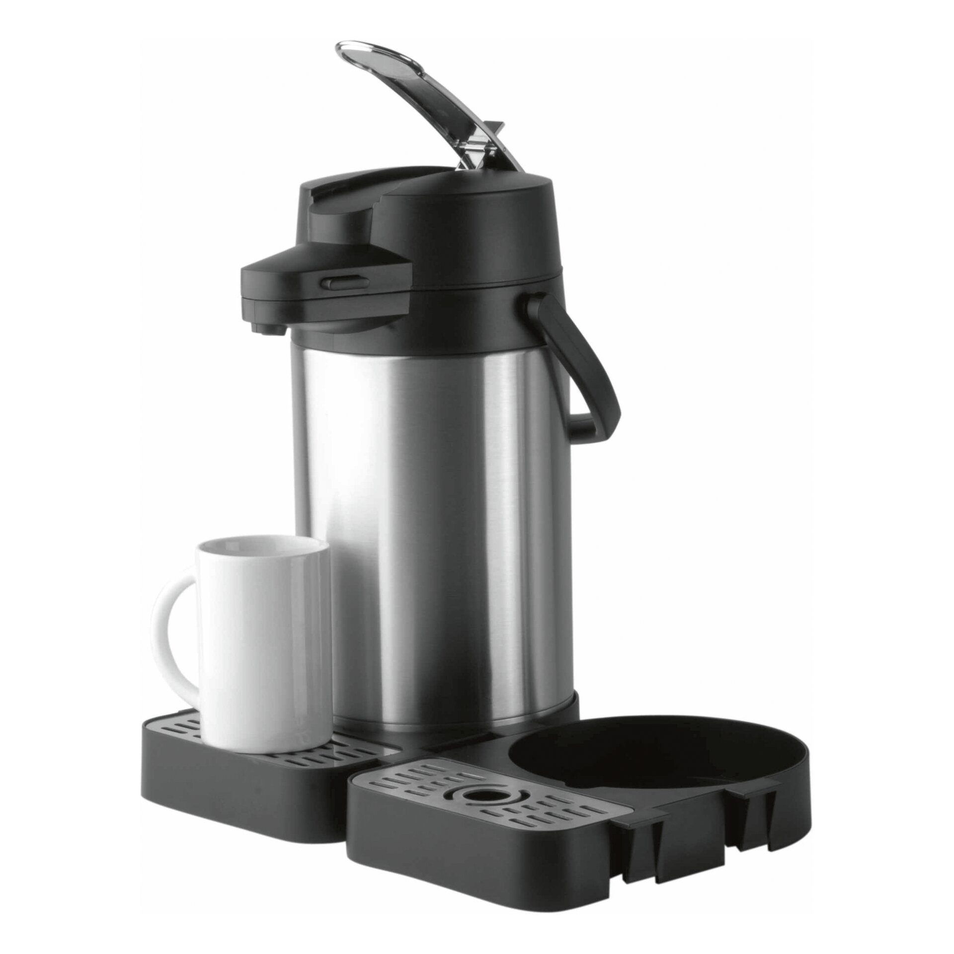 Ideal für die dezentrale Kaffeeversorgung. Pro Pumpvorgang können, je nach Füllstand, ca. 120 ml Flüssigkeit ausgepumpt werden. Dank des stabilen Tragegriffes ist die Coffeestation leicht und einfach zu transportieren. Die im Boden eingearbeitete Drehvorrichtung ermöglicht es, die Kanne um 360°C um die eigene Achse zu drehen. Mit aufgeklapptem Deckel passt die Coffeestation unter viele Kaffeeautomaten.