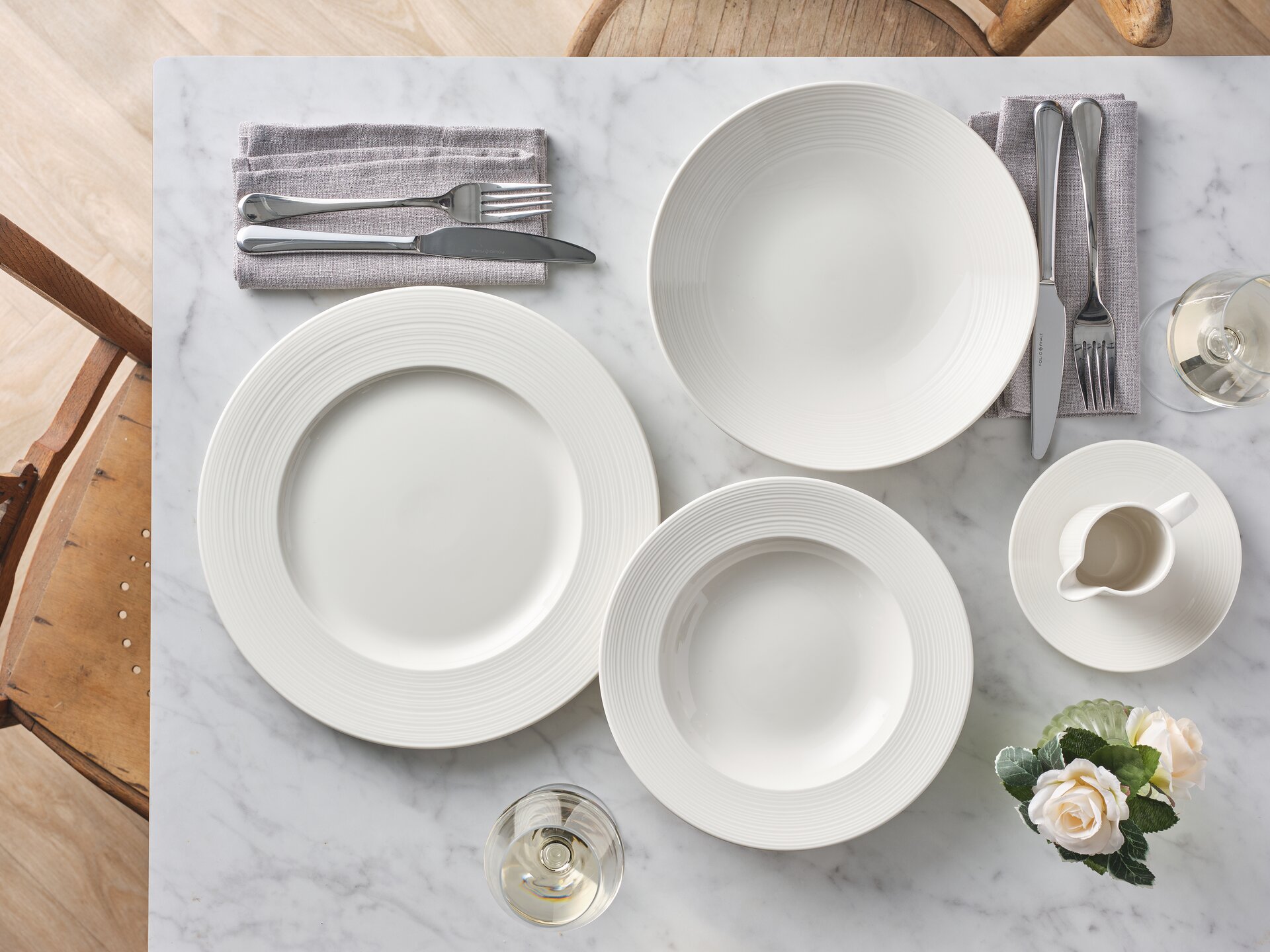 Die Concorde-Reihe ist von der anspruchsvollen Ästhetik des klassischen Mid-Century-Stils durchdrungen. Klare Linien und eine frische, dezente haptische Oberfläche harmonieren mit einem warmen, ansprechenden, cremefarbenen Ton, um einen lässigen und dennoch klaren Präsentationsstil für Speisen zu schaffen. Alle Artikel wurden sorgfältig entworfen, um in einer geschäftigen Küche diskret zu funktionieren und gleichzeitig eine hervorragende Haltbarkeit zu bieten. Ein Schlüsselmerkmal ist die Stapelbarkeit, die eine effiziente Lagerung von Gegenständen ermöglicht, ebenso wie die Kompatibilität, die es ermöglicht, verschiedene Gegenstände übereinander zu stapeln und eine gemeinsame Untertasse zu verwenden. Durch die Verwendung von Coupé- und Randprofilen bietet die Concorde-Reihe eine moderne und dennoch funktionale Ästhetik, um die allerbeste Küche zu präsentieren.