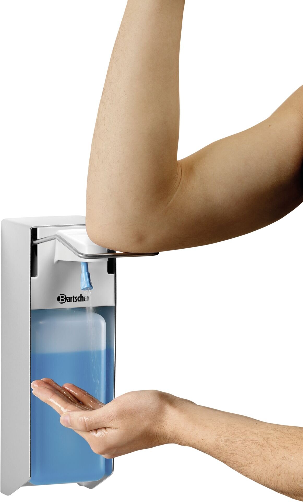 Aluminium/PP/ABS, weiß/silber, Pump/Sprühsystem. Schnelle und unkomplizierte Händedesinfektion für max. Schutz. Mit dem kartuschenlosen Pumpsystem schafft der Spender mit Ellbogenbedienung optimale Hygienebedingungen. Inkl. Wandhalter und Befestigungsmaterial.