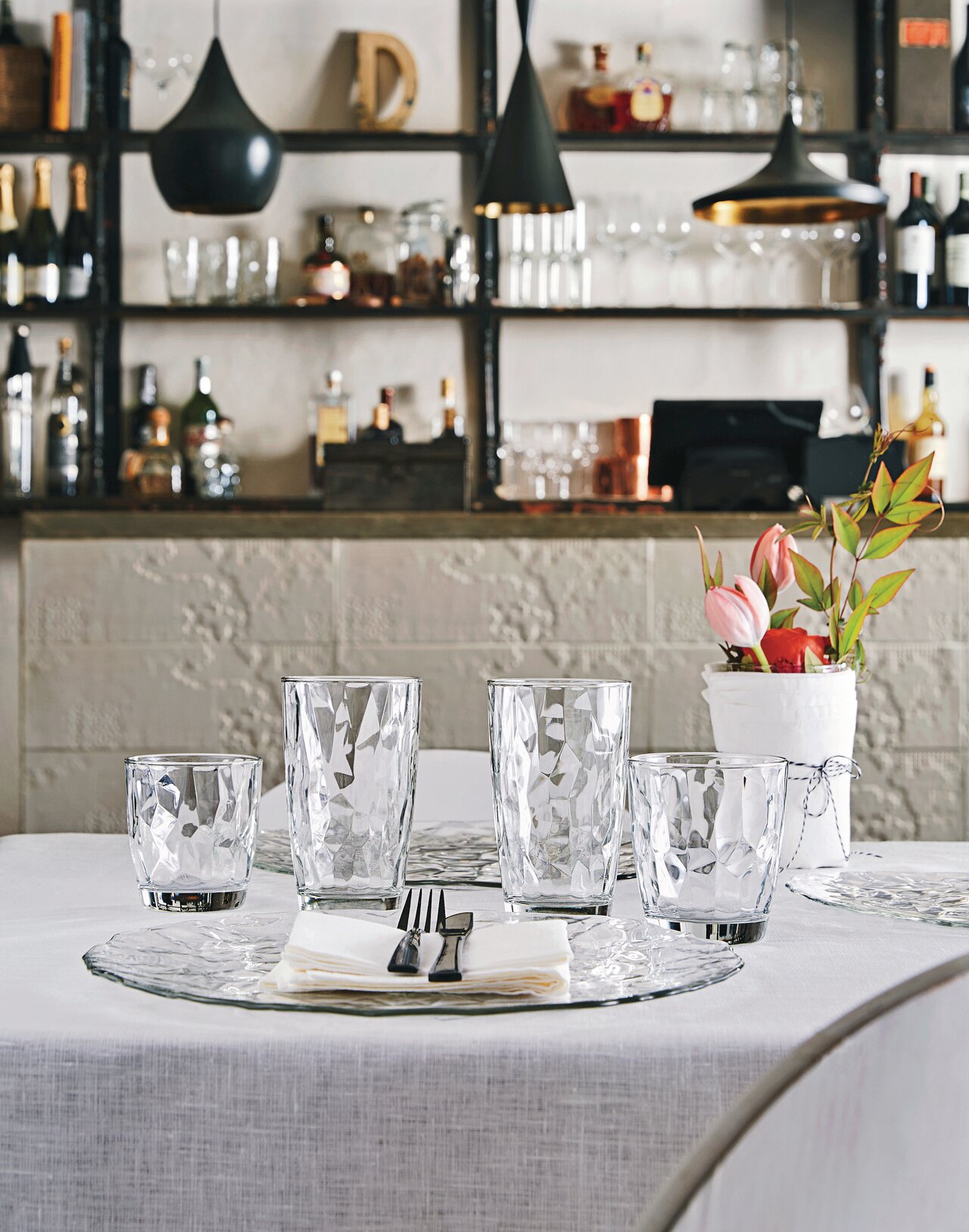 DIAMOND, eine klassische und stilvolle Serie. Die Struktur, welche nur von innen fühlbar ist, lässt ein Lichtspiel entstehen und passt, ob transparent oder in Farbe, auf jeden schön gedeckten Tisch.