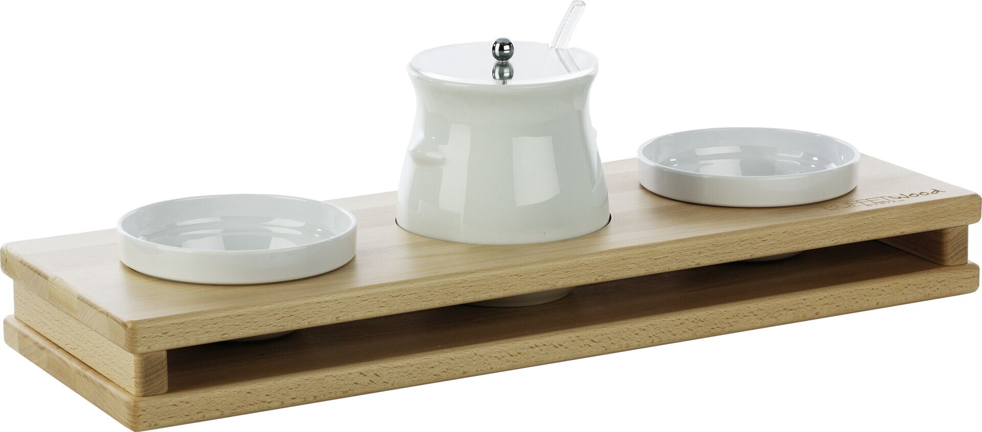 Buche. Passend zu Buffetsystem "Wood". Ecken abgerundet. Mit Gummifüßchen. Plattenstärke: 2 cm.
