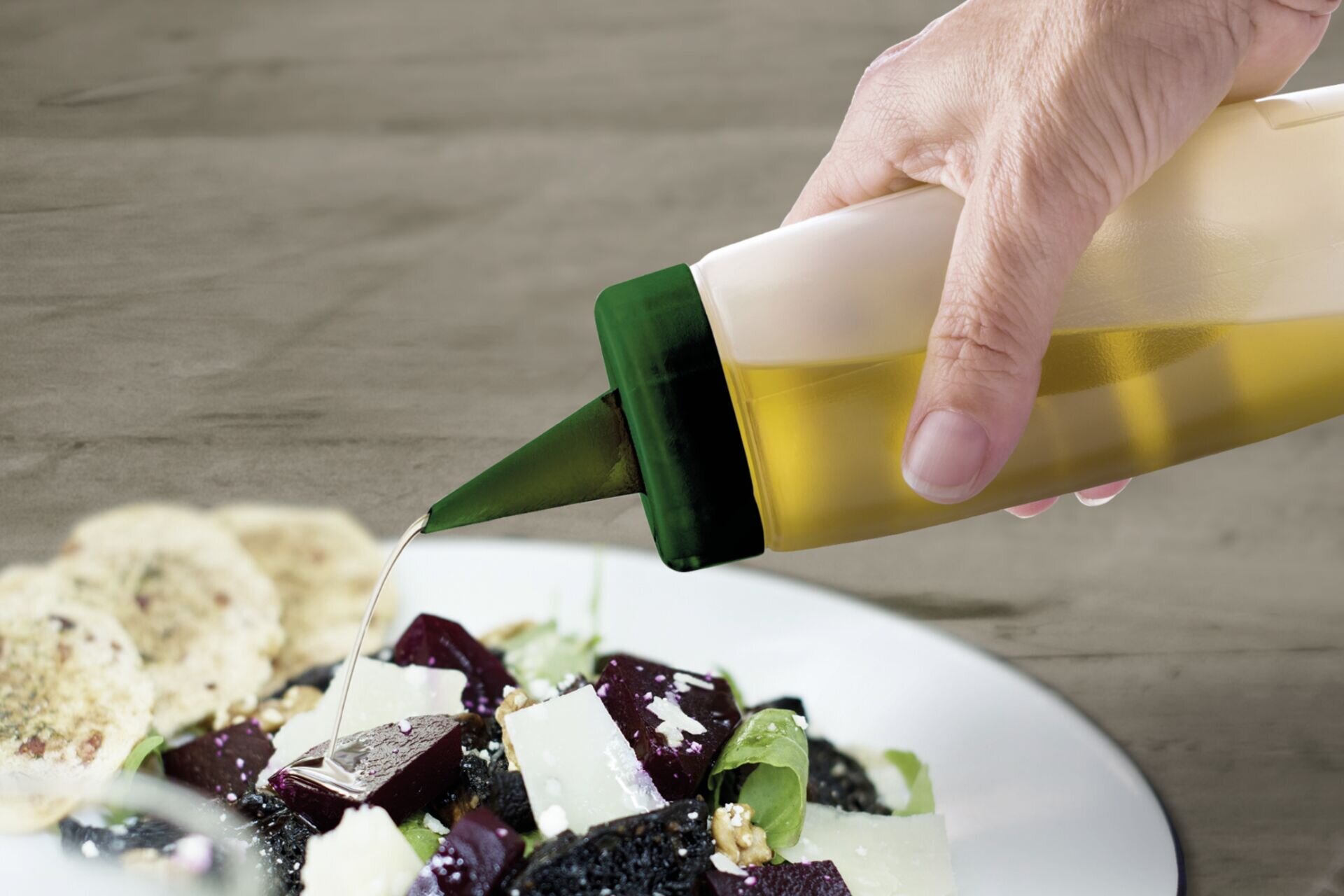 Speziell für Öle, Dressings, Sojasauce, Teriyaki, leichte Dressings, Saucen mit geringer Dichte. Die überschüssige Flüssigkeit, die durch die Düse abfließt, gelangt durch das im Deckel vorgesehene Loch in das Innere der Flasche zurück (Rücklaufsystem). Dieses Loch reguliert wiederum den Tropfenfluss bei der Abgabe. Inkl. Verschlusskappe. Deckel mit Schraubverschluss. Extra Feld für Beschriftung, sowie Datierung. Beidseitig, gespiegelte Skala in ml und oz. Einfache Reinigung. Leichte Befüllung durch große Öffnung. Ergonomischer Griff ermöglicht die Steuerung des Durchflusses durch den ausgeübten Druck. Polyethylen (LDPE): weißliches Aussehen, ohne Farbstoffe, sehr flexibel, weich und elastisch, sehr hohe Elastizitätsgrenze, stellt Form nach Verformung wieder her, gute mechanische und optische Eigenschaften. Temperaturbereich -40°C bis +90°C. Spülmaschinengeeignet.
