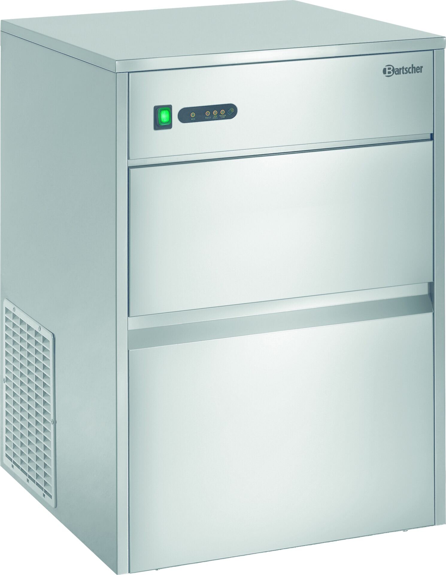 Edelstahl. Ausführung Eiswürfel: Kegelform (Hohlkegel). Produktion max. 25 kg/24 Std. Der Vorratsbehälter umfasst ca. 7 kg. Durch die Luftkühlung halten Sie bitte zu allen Seiten einen Abstand von ca. 10 cm! Gewicht: 30kg. Festwasseranschluss 3/4 Zoll, Wasserablauf Ø 21 mm. Kühlmittel R290.