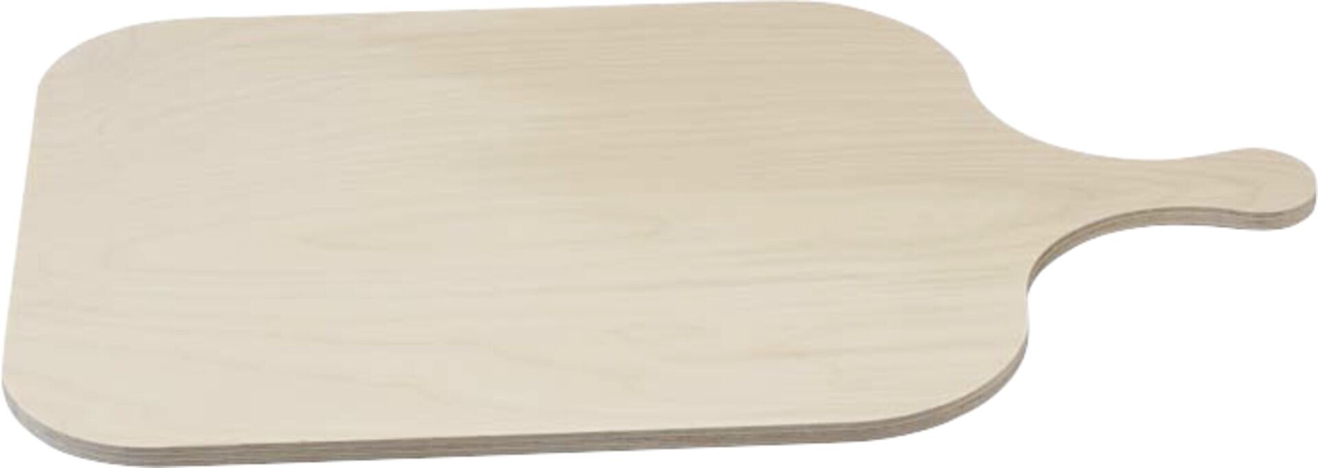 LxBxH in cm: 51x30,5x0,9 Birkenmultiplex (Holz unbehandelt). Ecken abgerundet. Länge ohne Griff 38 cm. Nicht spülmaschinenge…