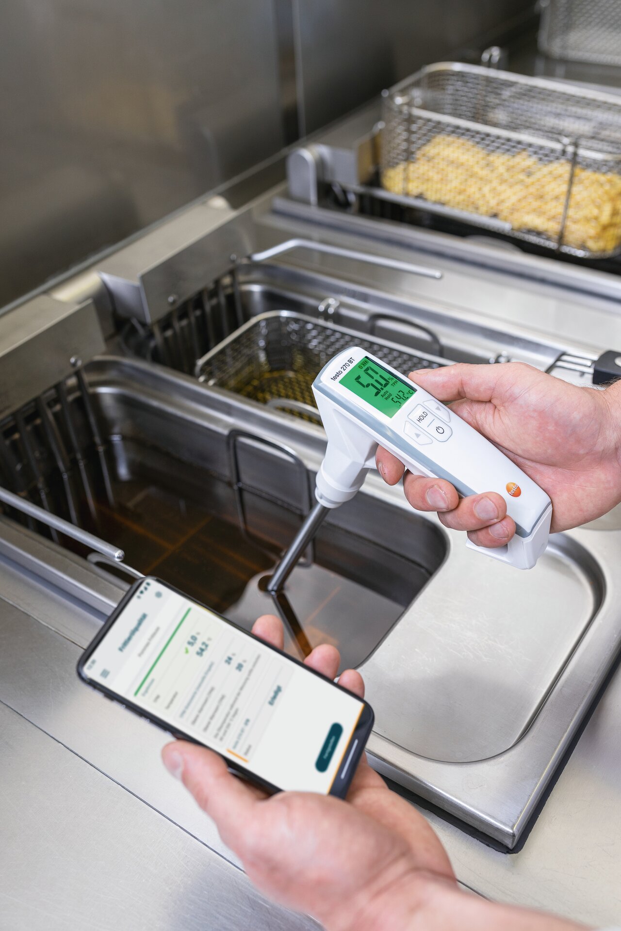 Der neue Frittieröl-Tester testo 270 BT ermöglicht eine noch einfachere, schnellere & zuverlässigere Überwachung der Frittierölqualität dank seiner Anbindung an die testo Smart App. Mit dieser neuen Version behalten Sie die TPM-Werte Ihres Frittieröls noch besser im Blick und können alle relevanten Daten direkt auf Ihrem mobilen Gerät anzeigen und analysieren.