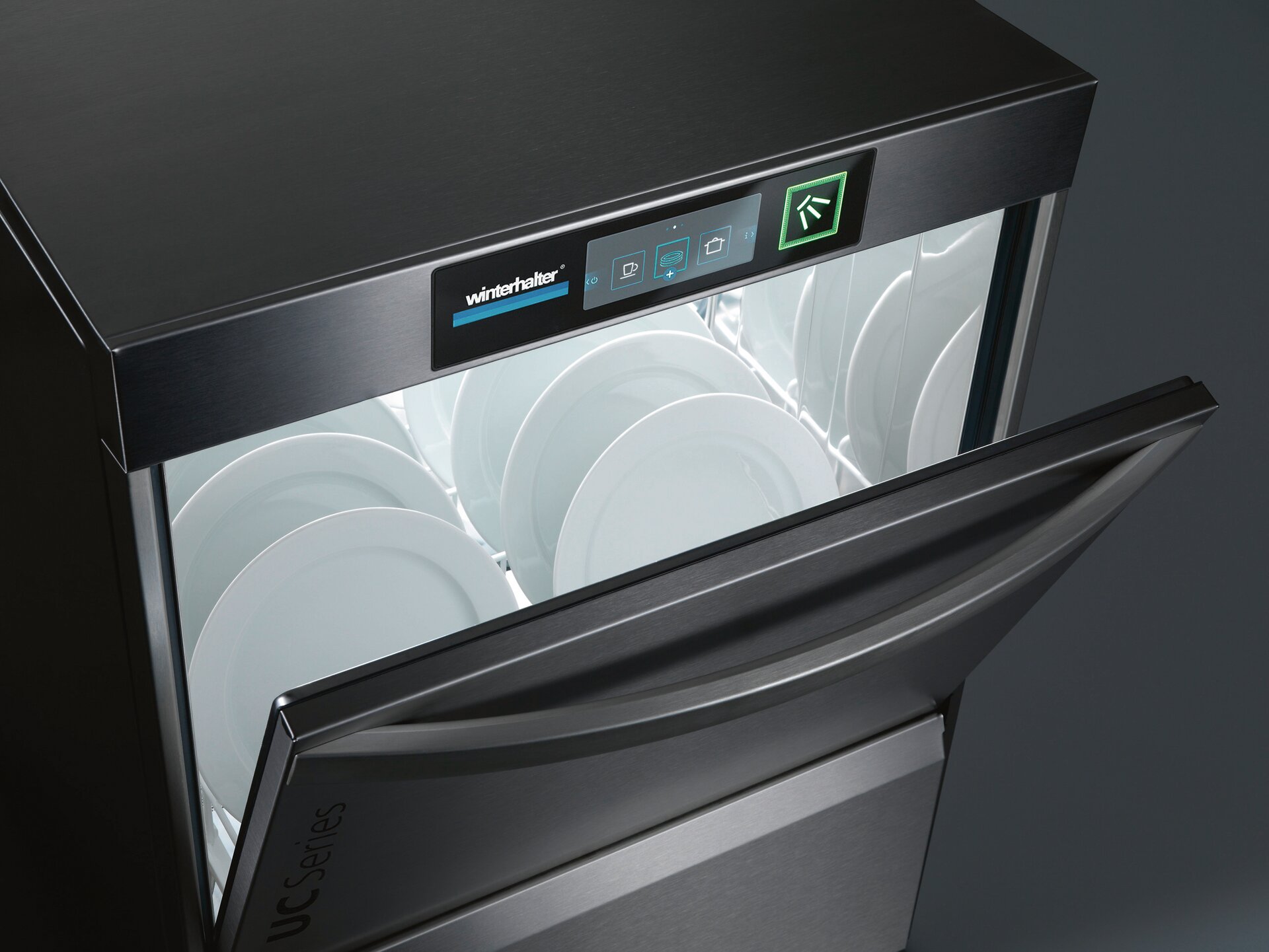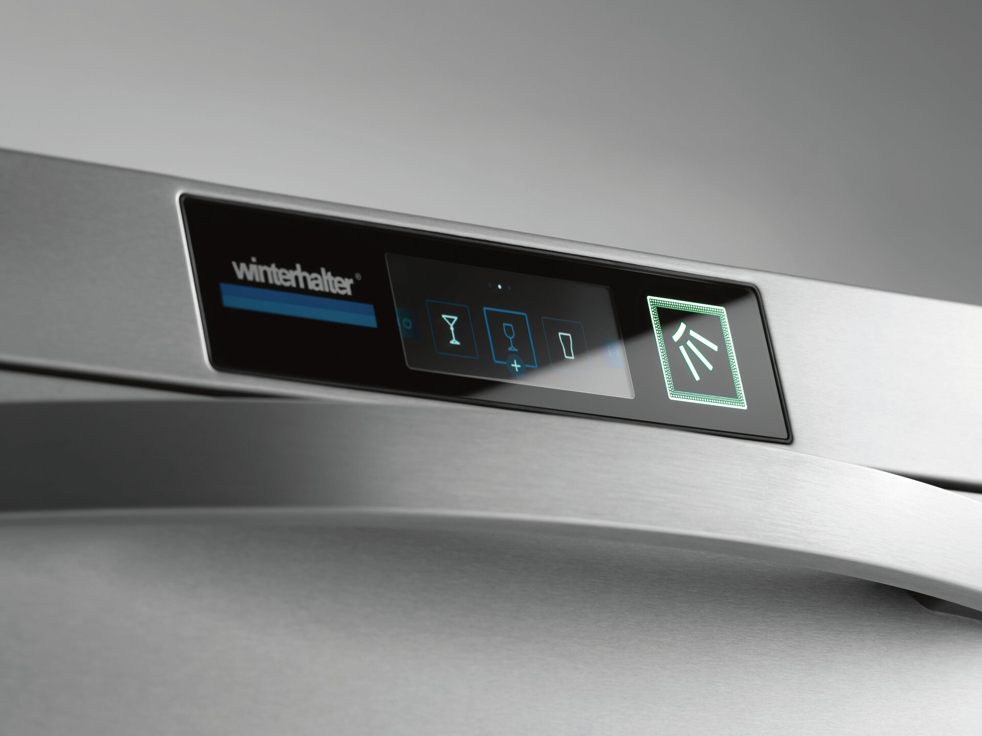 › mit QR-Code – für einfachen Zugang zur digitalen Servicewelt von Winterhalter (In Verlängerung des Displays, an der rechten Vorderseite der Maschine)