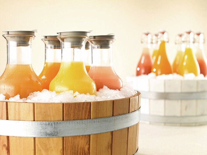 Getränkepräsentationen mit Karaffen oder Flaschen leicht gemacht. Ein variantenreiches Angebot an verschiedenen Säften, Weinen und Champagner in den attraktiven und stets gekühlten Standfüßen. Unterschiedliche Konzepte sorgen für neue Ideen auf dem Buffet.