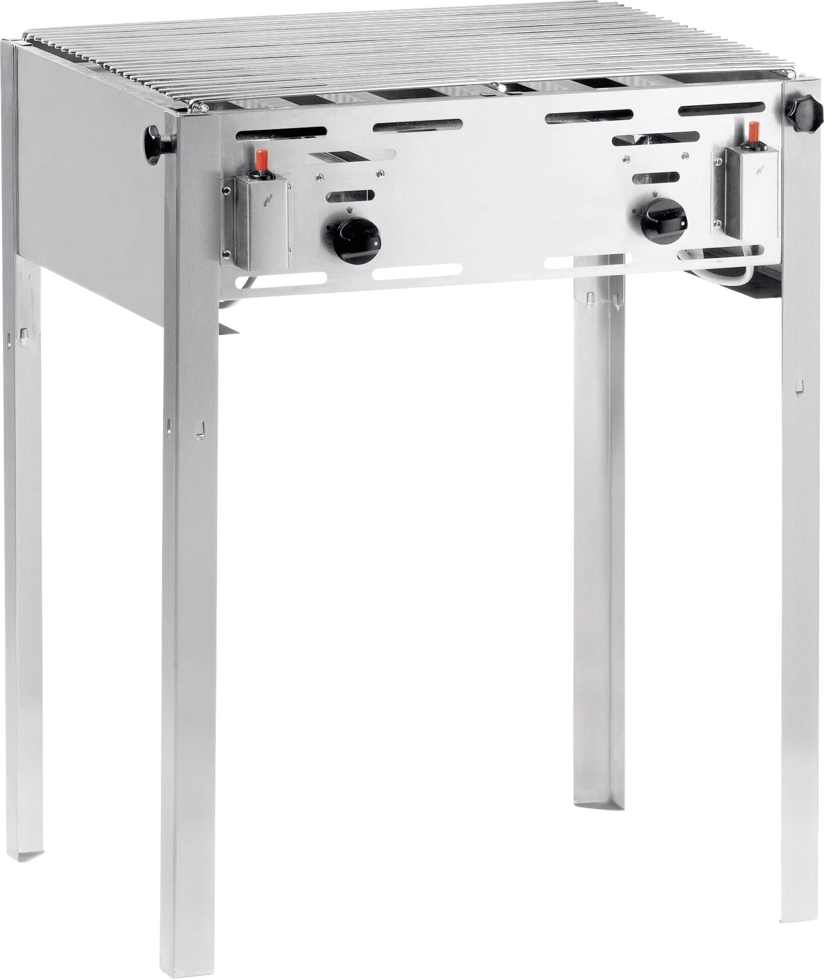 Edelstahl 18/0 mit emaillierter Grill-/Bratpfanne, sowie einem vernickeltem Rost (590x480 mm innere Abmessung). Elektronisches Zündgerät (Piezo-Zündung) und Thermoelement-Ventil. Mit Gasschlauch und Druckregler. Geeignet für Gasflaschengas (Propan-/Butangas). Verbrauch 0,430 m³/h. 11,6 Kw. Abnehmbare Standbeine - daher Einsatz als Tisch- oder Standmodell. Zur Verwendung im Außenbereich.