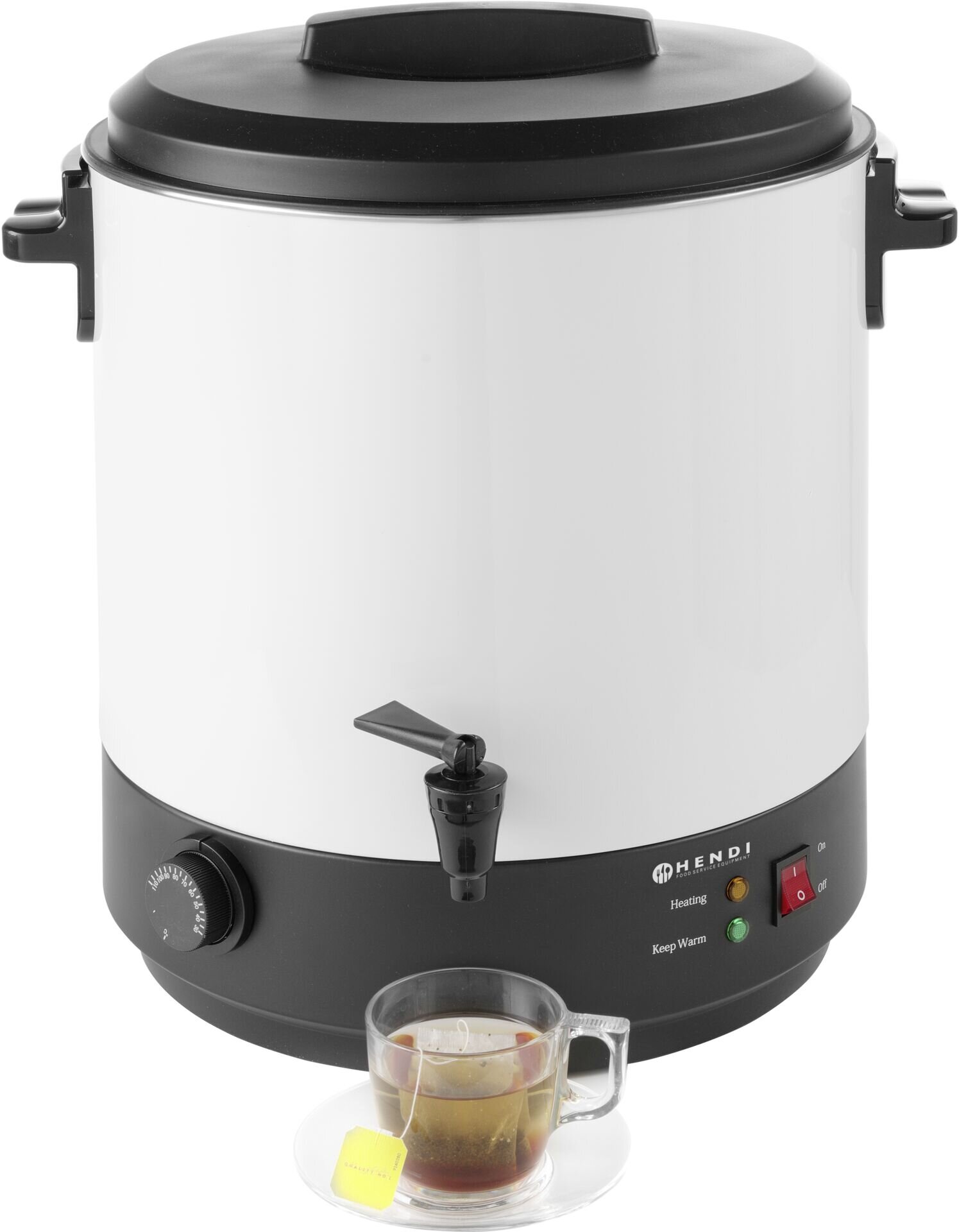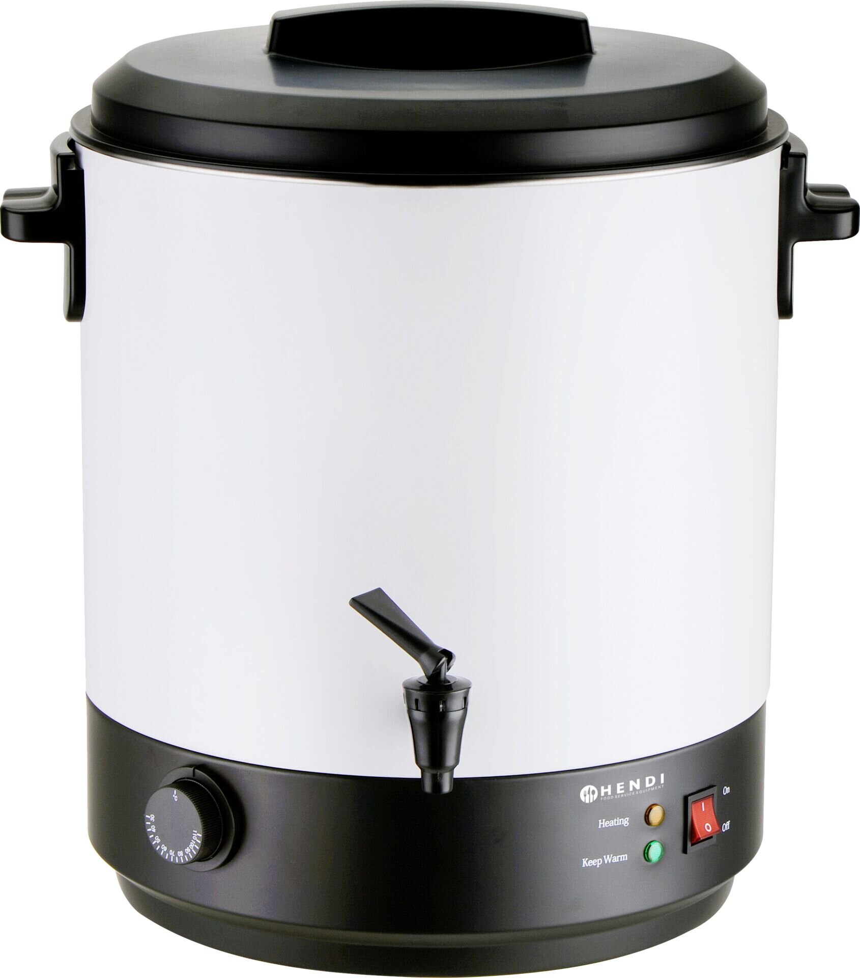 Kessel aus beschichtetem Edelstahl. Wärmeisolierte Griffe aus Polypropylen und Anti-Tropf-Ablasshahn. Thermostat einstellbar bis 110°C. Ideal für Glühwein und heißes Wasser. Aufheizdauer ± 75 min. Nicht geeignet für heiße Schokolade oder Milch. 25 Liter Nutzinhalt, 230 V, 2500 W, LxBxH in cm: 44,7x44,1x48,5 cm.