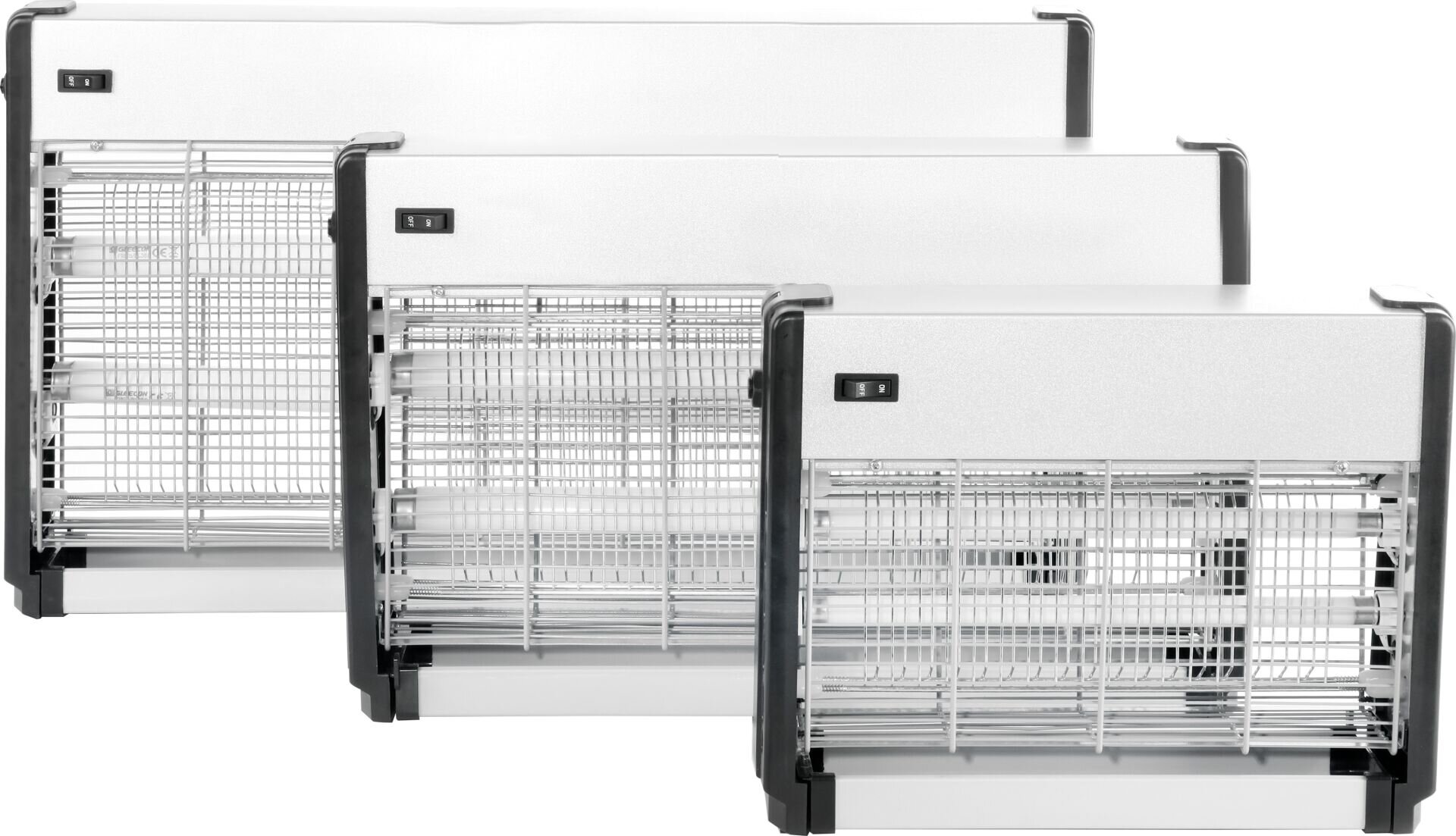 Elektronischer Insektenvernichter mit einem Gehäuse aus einer speziellen Aluminiumlegierung und feuerfestem ABS-Kunststoff. Einfache Reinigung durch herausnehmbare Schublade. 2 UV-A-Leuchtstoffröhren. Gitterspannung 2500 V. Anschlusswert 230 V. Als Decken- oder Standgerät einsetzbar. Nur zur Verwendung im Innenbereich.
