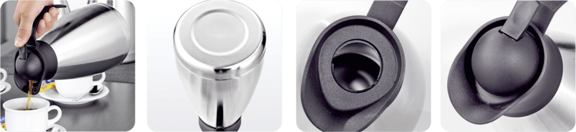 Edelstahl, satiniert. Unzerbrechlicher Edelstahleinsatz, doppelwandig isoliert. Einhandbedienung, funktionell, praktisch und schönes Design. Farbe/Deckel: schwarz. Nicht spülmaschinengeeignet.
