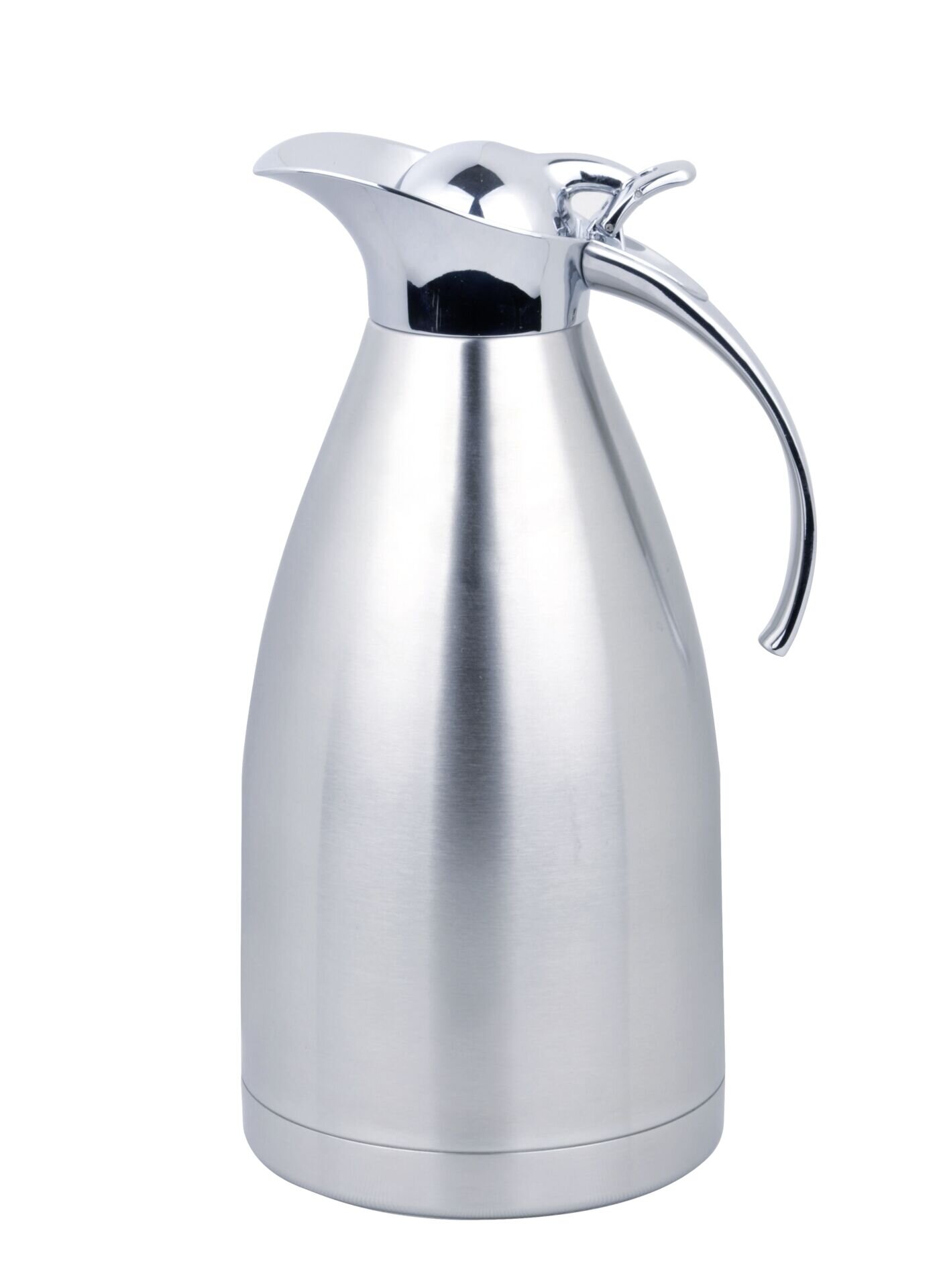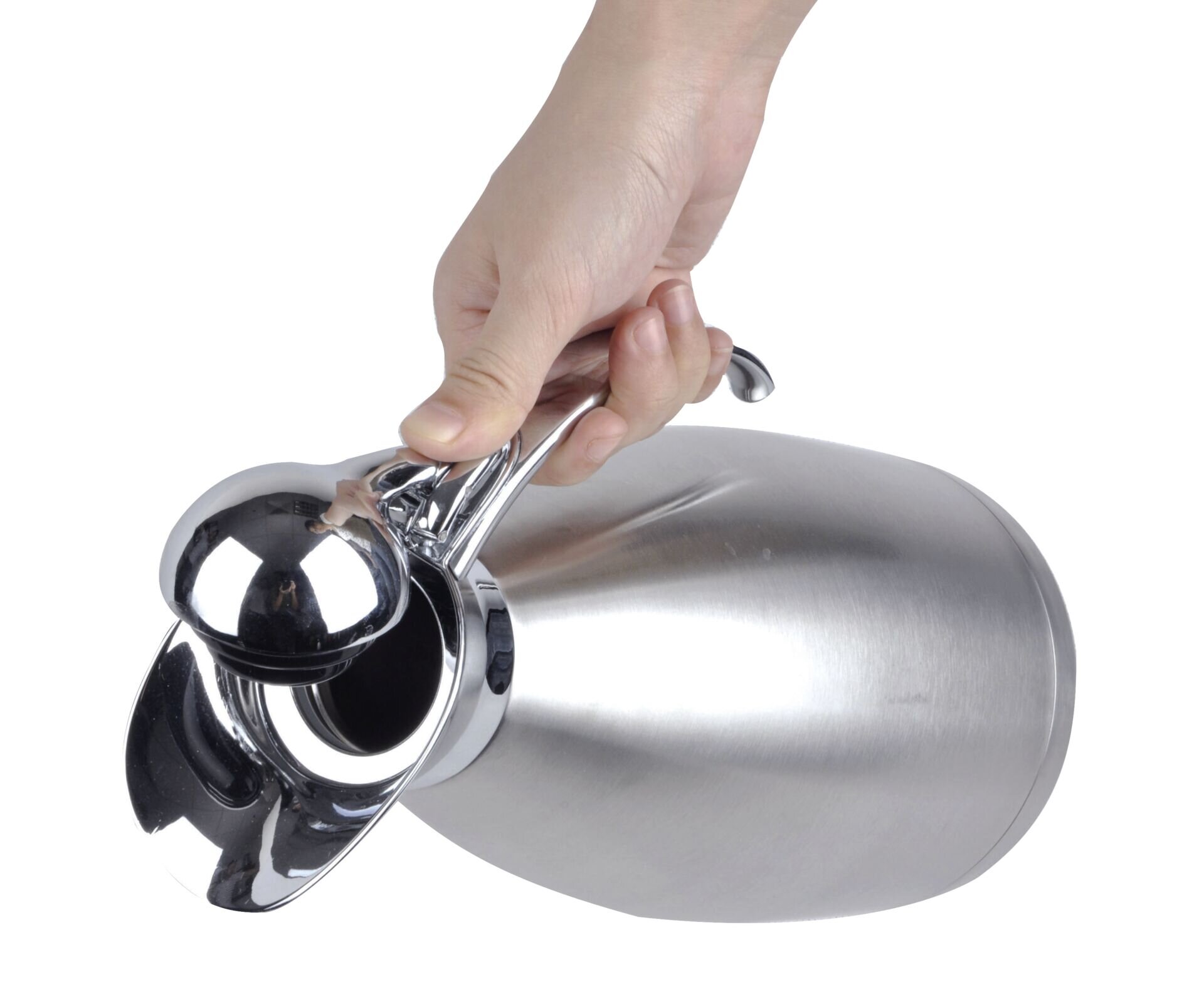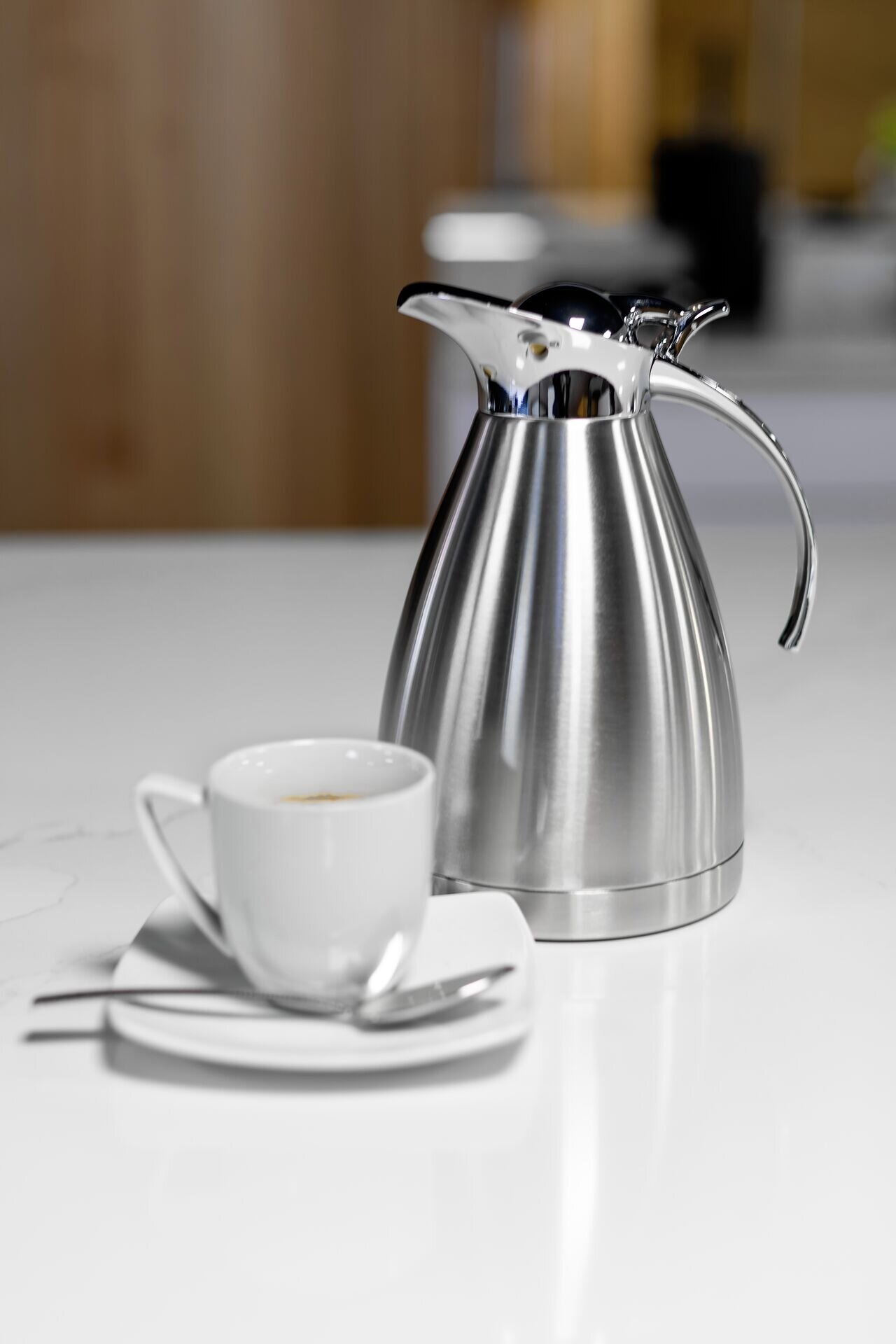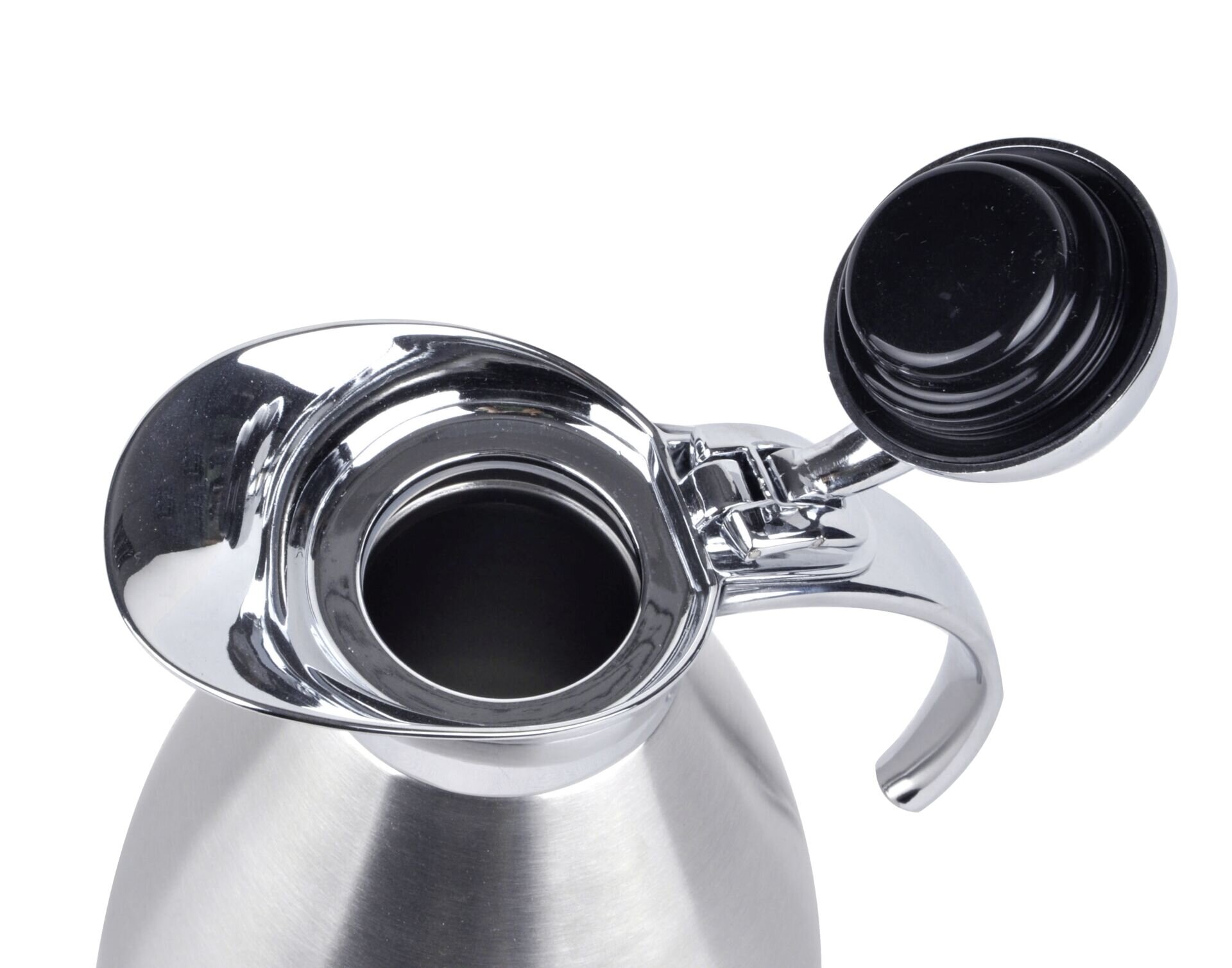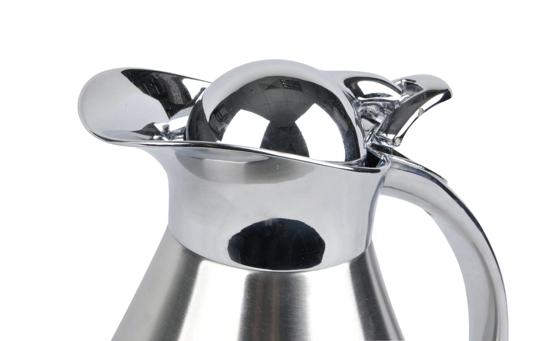 Edelstahl, satiniert. Deckel und Griff glänzend. Unzerbrechlicher Edelstahleinsatz, doppelwandig isoliert. Einhandbedienung. Funktionalität trifft auf edles Design. Dichtschließender Vakuumdeckel. Spülmaschinengeeignet.