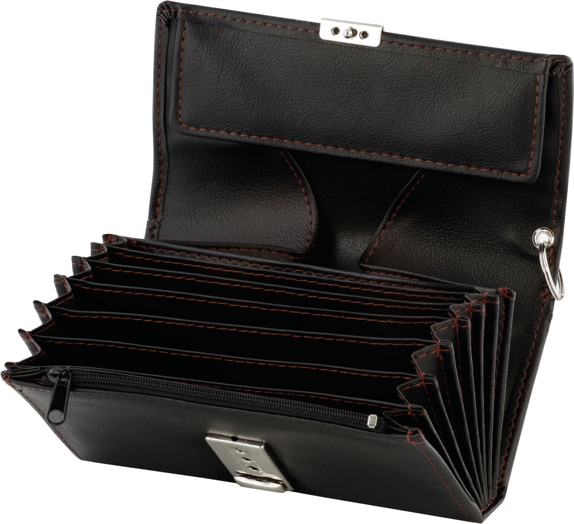 Kunstleder/Feinsynthetik, schwarz, braun abgenäht. Kellnerbörse inkl. Schlüsselkette mit Karabiner, besteht aus: 1x Münzfach, 7x Scheinfach, 1x Reißverschlussfach, 1x Steckfach an der Rückseite. Revolvertasche bestehend aus 1x Fach für die Kellnerbörse und 1x Zusatzfach für Notizblock und Kugelschreiber.