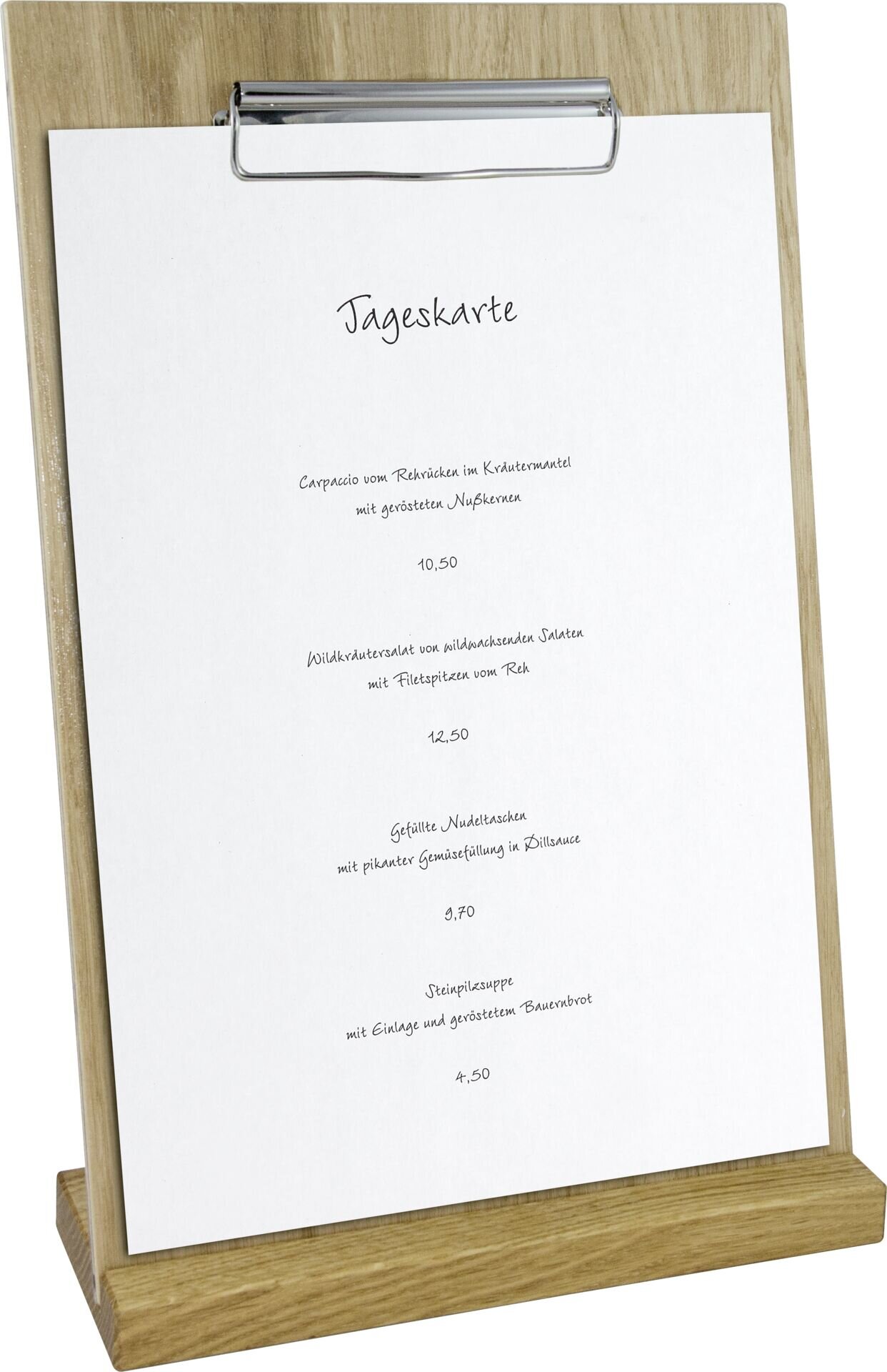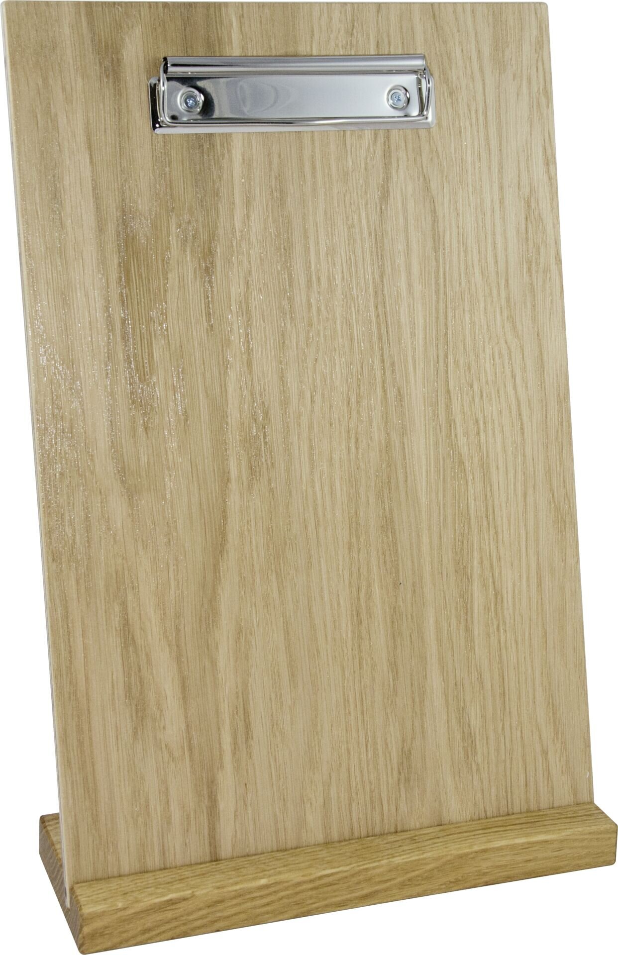 Eichenholz. Mit Klemmleiste. Abgerundete Ecken. Mit dem Speisekarten-Klemmbrett kann ganz einfach die Tageskarte oder Ihr speziell auf den Gast abgestimmtes Menü ausgetauscht werden. Die passende Klemmbretthalterung bitte separat dazu bestellen.