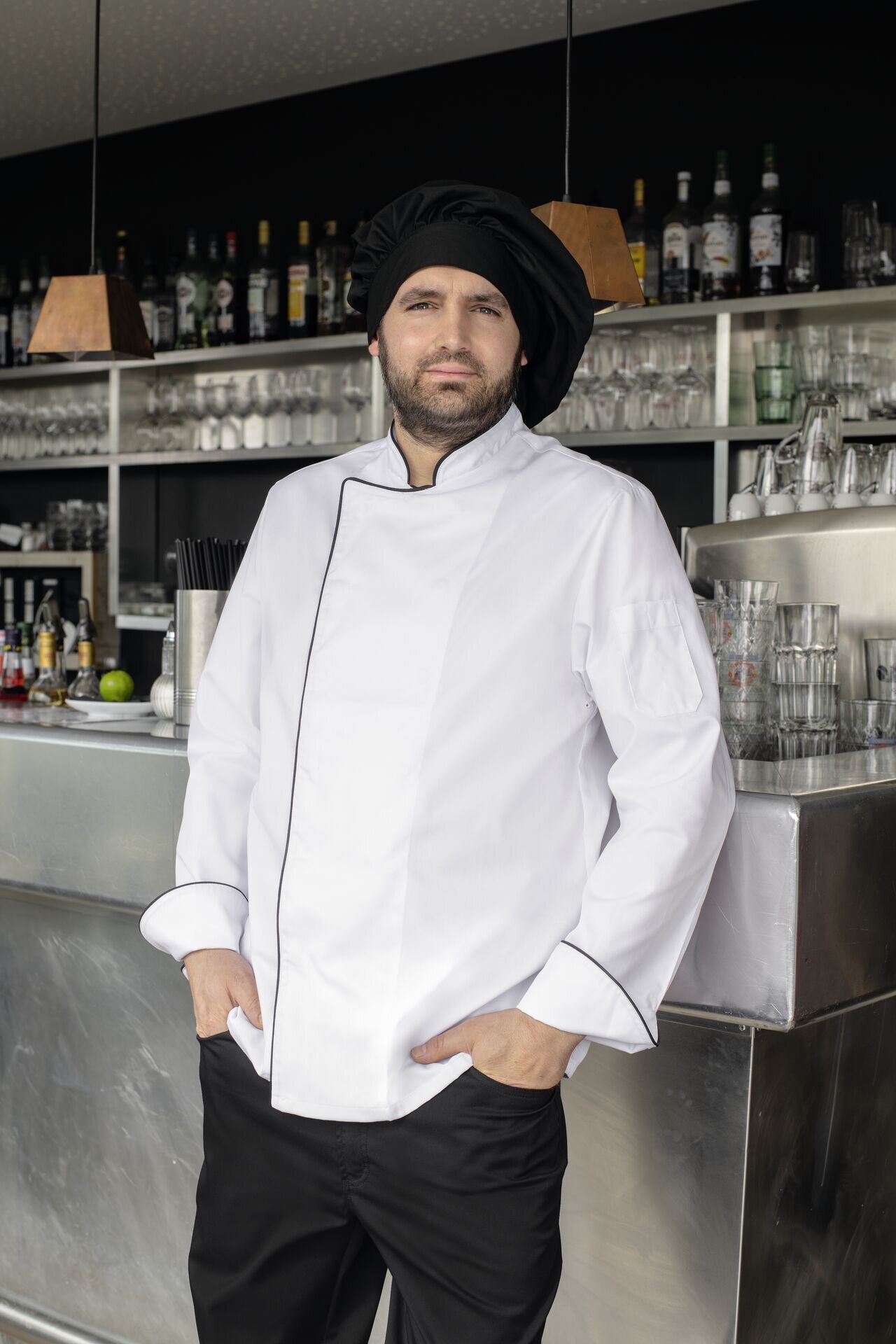 Farbe: weiß mit schwarzer Paspelierung. 65% Polyester + 35% Baumwolle, 210g/m². Regular fit. Armtasche, verdeckte Druckknöpfe, Lüftungslöcher, Wiener Nähte im Rücken. Ärmel mit Umschlagmanschette. Waschen: Normalwaschgang 95°C, Bleichen: nicht bleichen, Trocknen: Trocknen im Tumbler, niedrige Temperatur, 60°C, normaler Trocknungsprozess, Bügeln: Bügeln mit einer Höchsttemperatur der Bügeleisensohle von 150°C, prof. Textilpflege: professionelle Trockenreinigung, normaler Prozess.