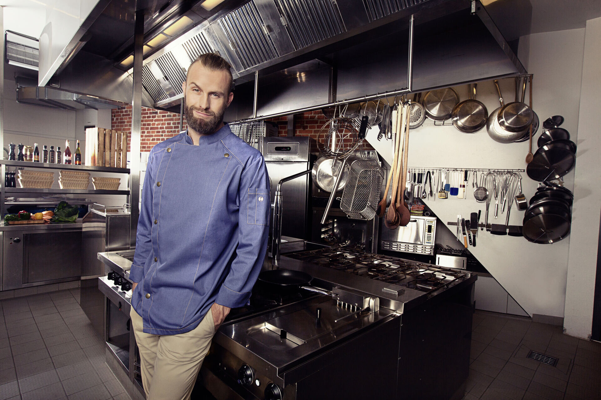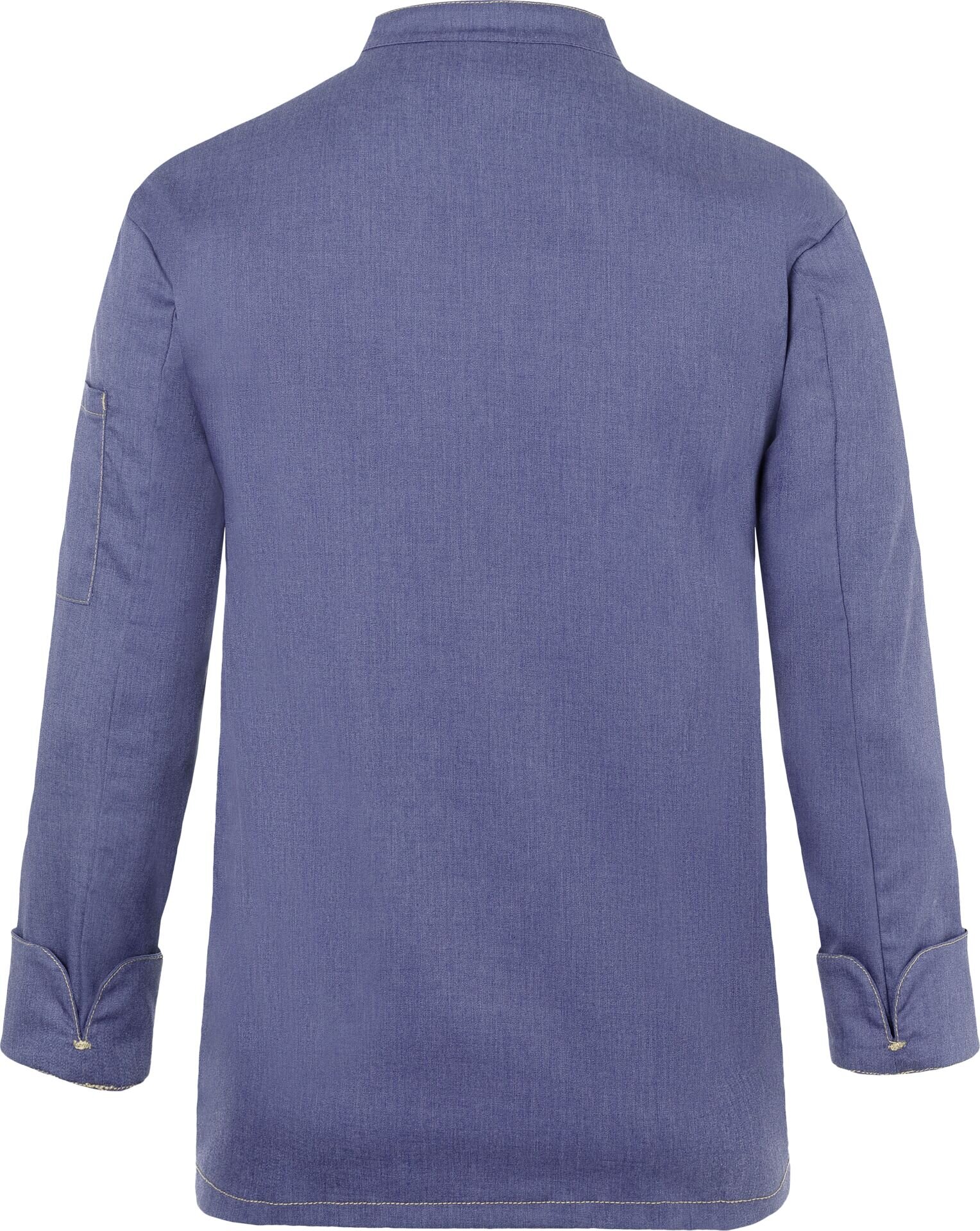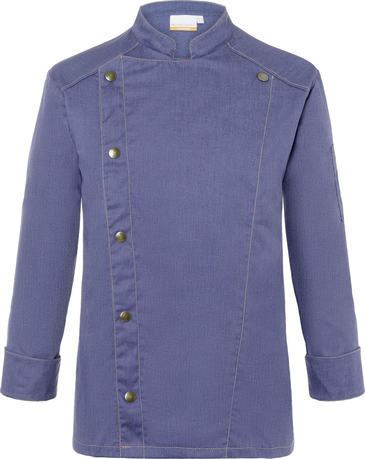 Farbe: Vintage blue. Trendige Kochjacke in Jeans-Optik mit schlanker Silhouette. Kontrastfarbige Steppnähte für den originalen Jeans-Look. Asymmetrisch geschlossene, einreihige 5-Knopf-Jacke mit Druckknöpfen zum schnellen Öffnen und Schließen. Ärmelmanschetten mit Schlitz. Aufgesetzte Ärmeltasche links mit praktischem Stiftfach. Industriewäschetauglich (95°C). 65% Polyester/ 35% Baumwolle. Köpergewebe, 195 g/m². Hochveredelt, gekrumpft, waschecht, pflegeleicht.