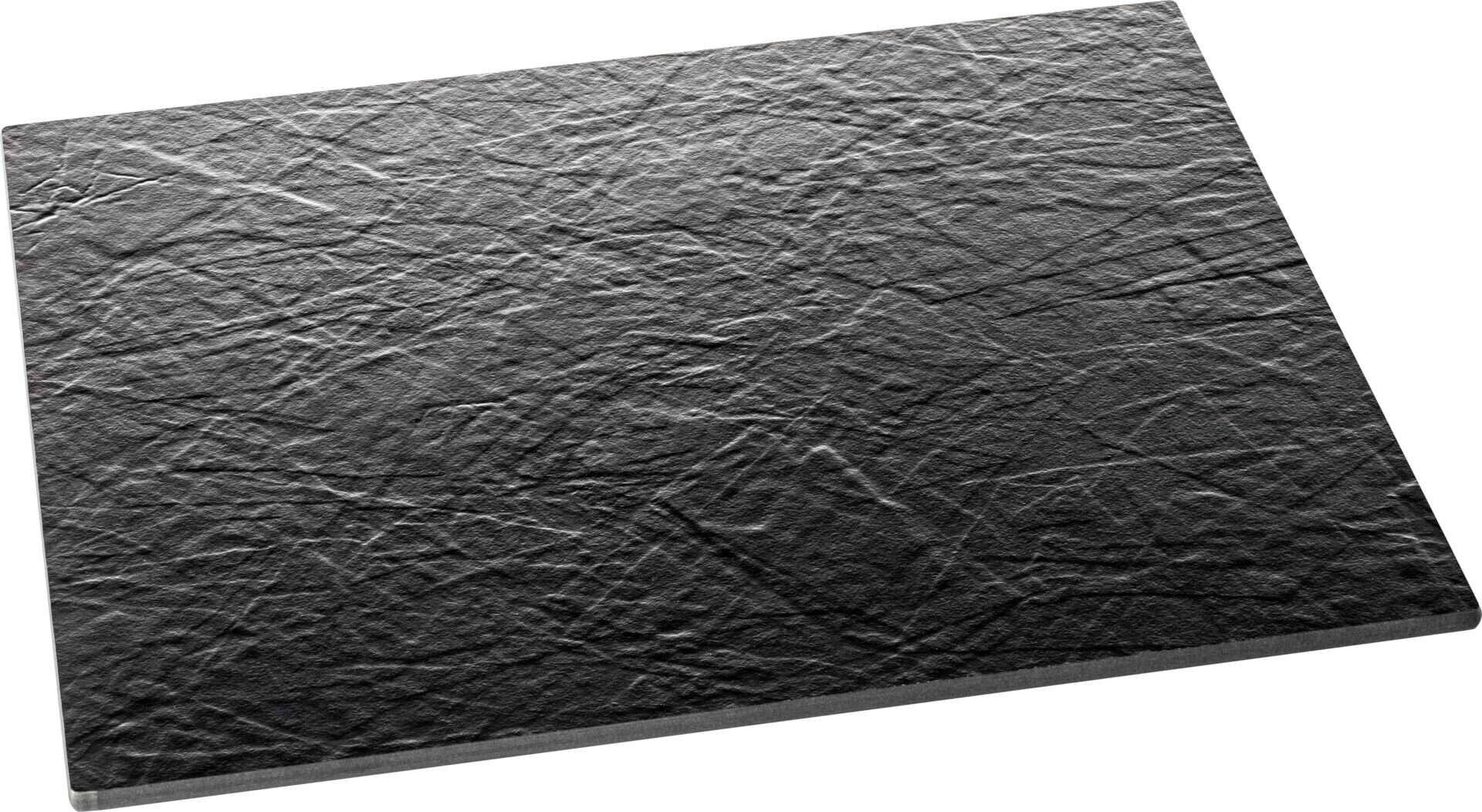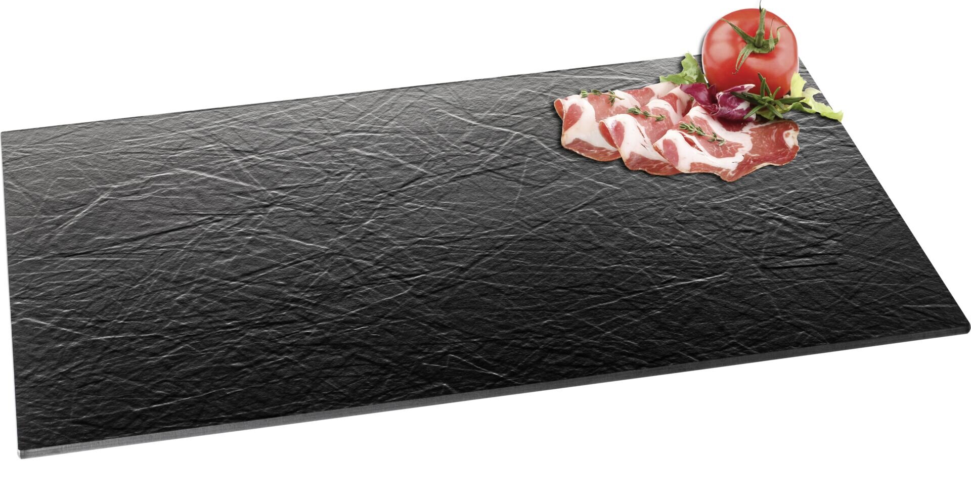 Kunstschiefer. Mit Antirutsch-Gummifüßchen. Lebensmittelunbedenklich, bruch- und kratzfest, geringes Gewicht, spülmaschinengeeignet, hitzefest bis 160°C (nicht für Backofen geeignet).