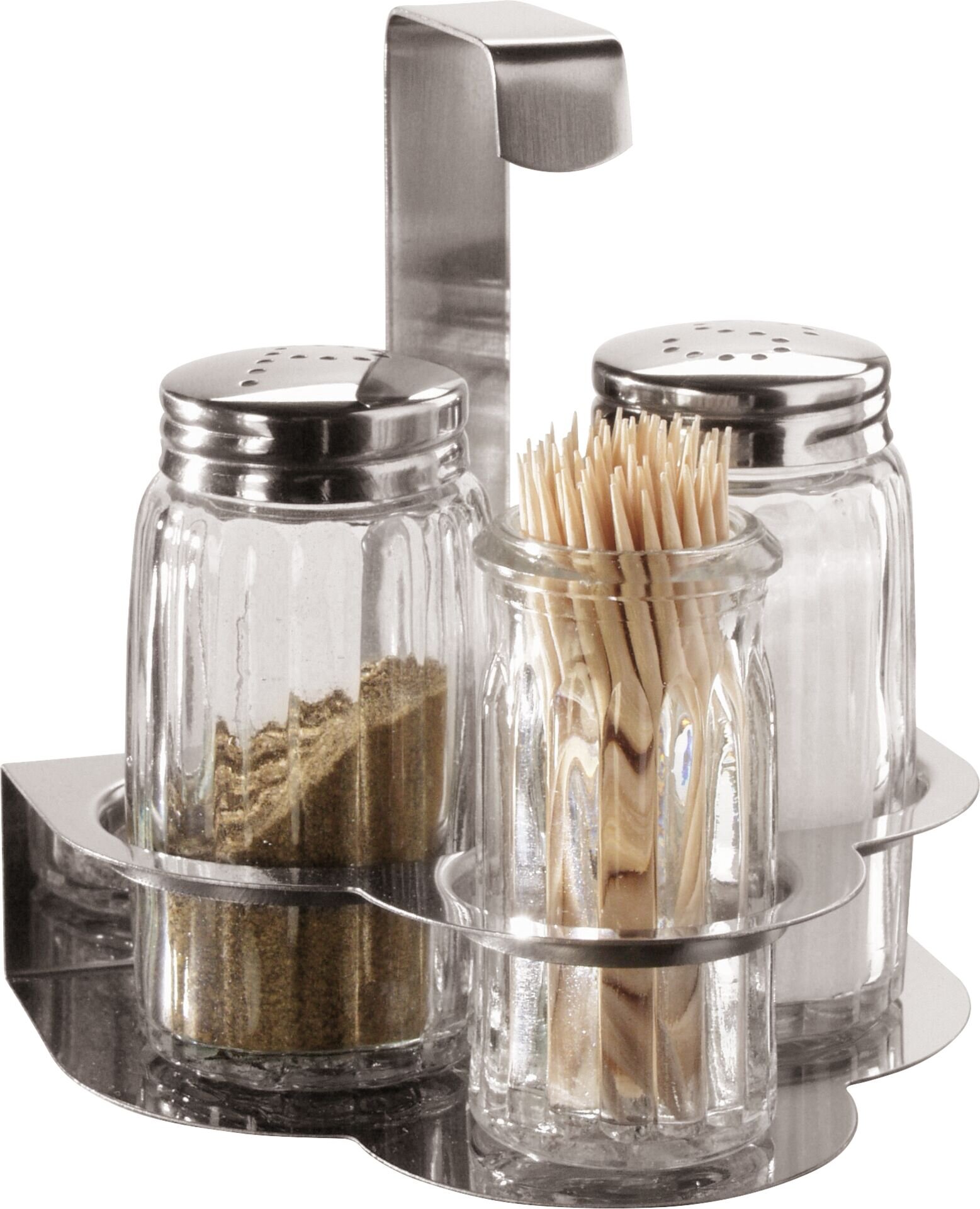 Höhe in cm: 13,5 Ausführung: 4-tlg. Glasbehälter mit Edelstahlkappe 18/0. Set bestehend aus Salz-, Pfefferstreuer, Zahnstocherglas und Menagengestell.