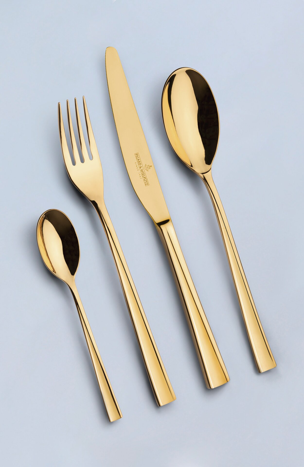 Unser PVD beschichtetes Besteck Monterey in der Farbe GOLD hat eine Materialstärke von 4 mm und vermittelt dadurch eine enorme Wertigkeit, ohne dabei klobig oder zu schwer zu wirken. Die lange Messerklinge und Zinken der Gabel stehen für ein modernes Design. Am Griff scheint der Stahl in sich verwunden und bietet ein Highlight mit der schräg verlaufenden Linie am Griff. Durch die besondere Form liegt das Besteck gut in der Hand und ist fein ausbalanciert.