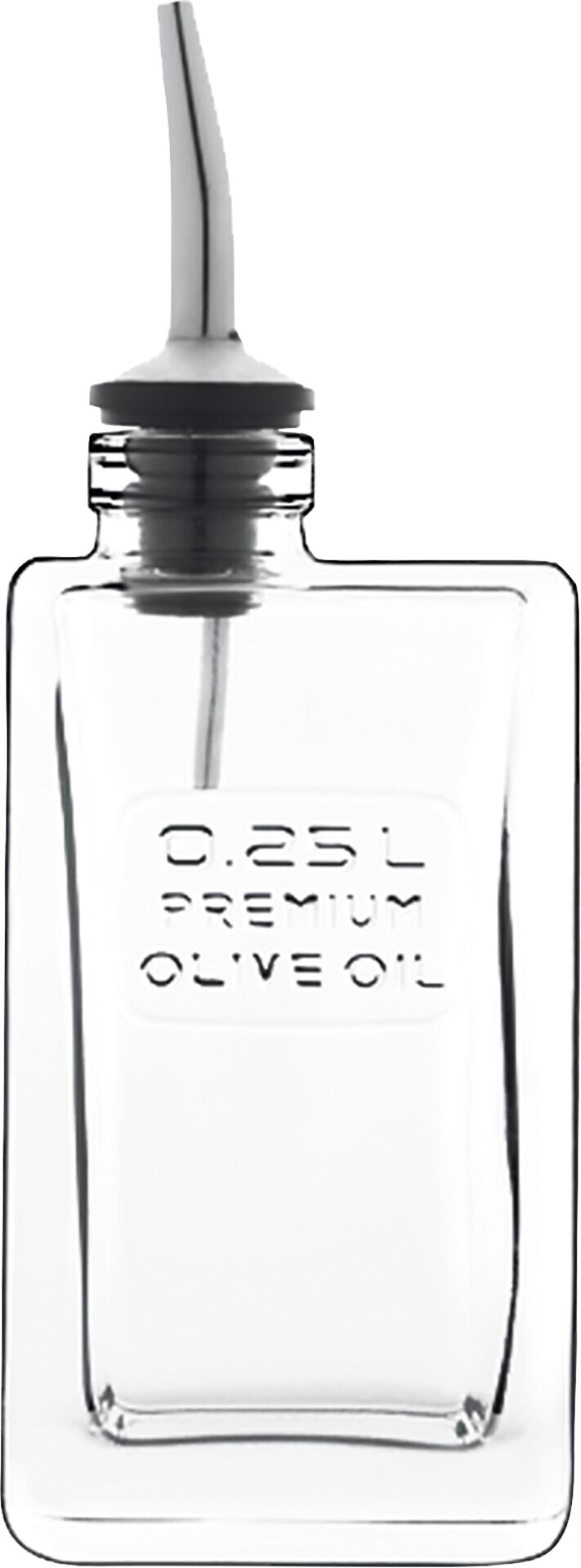 LxBxH in cm: 7,5x5,1x20 Inhalt in ml: 250 Glasflasche mit farbloser Prägung "0,25 L PREMIUM OLIVE OIL" und Ausgießer. Ausgießer bitte per Hand spülen.