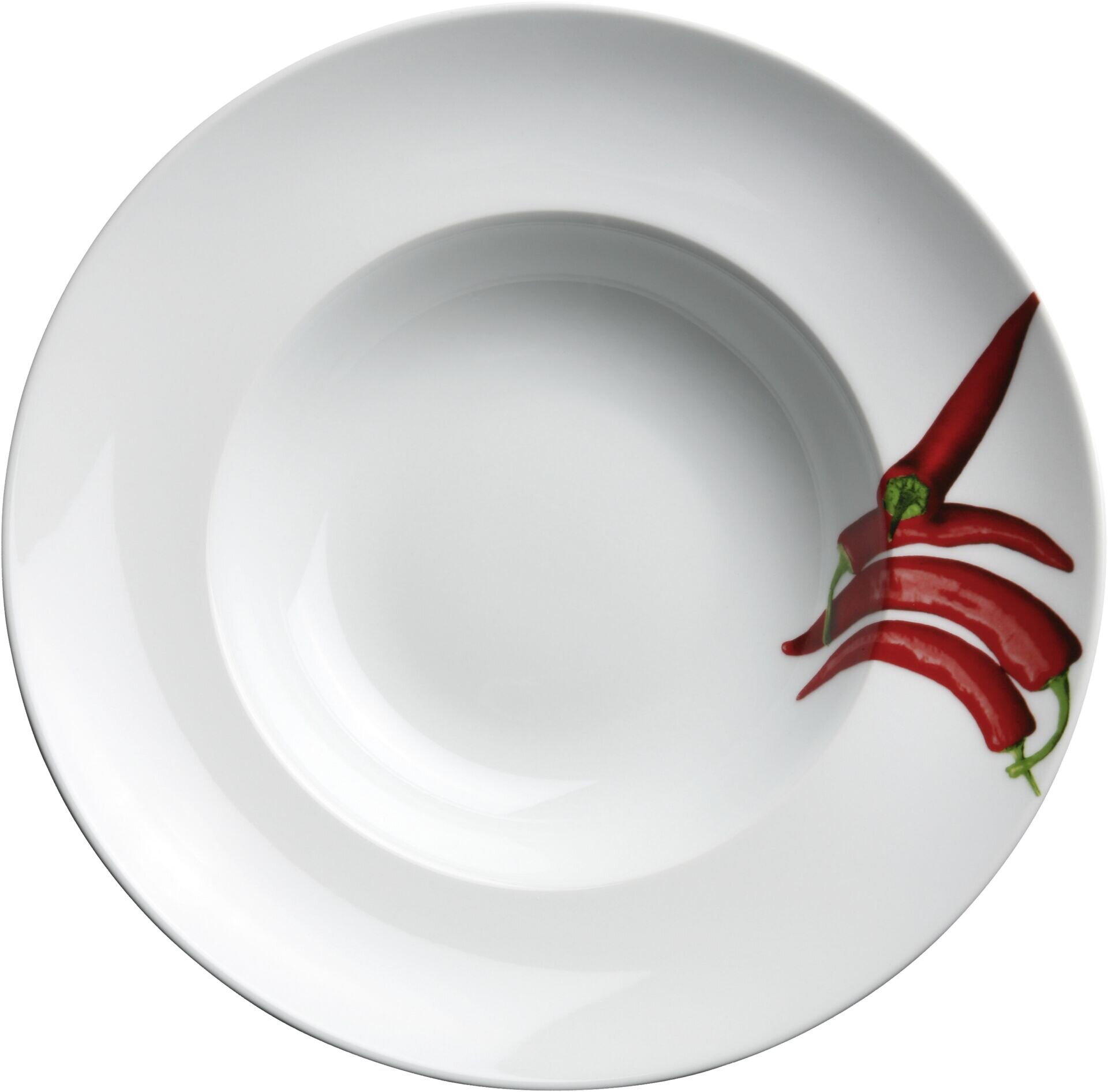 Porzellan, weiß mit Peperoni-Dekor. Mischsortierung. Robuste Ausführung.