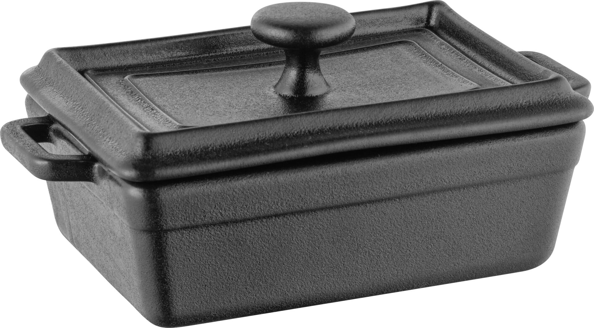 Porzellan. Optik wie Gusseisen. Farbe schwarz. Backofenfest bis 220°C. Spülmaschinengeeignet. Mischsortierung.