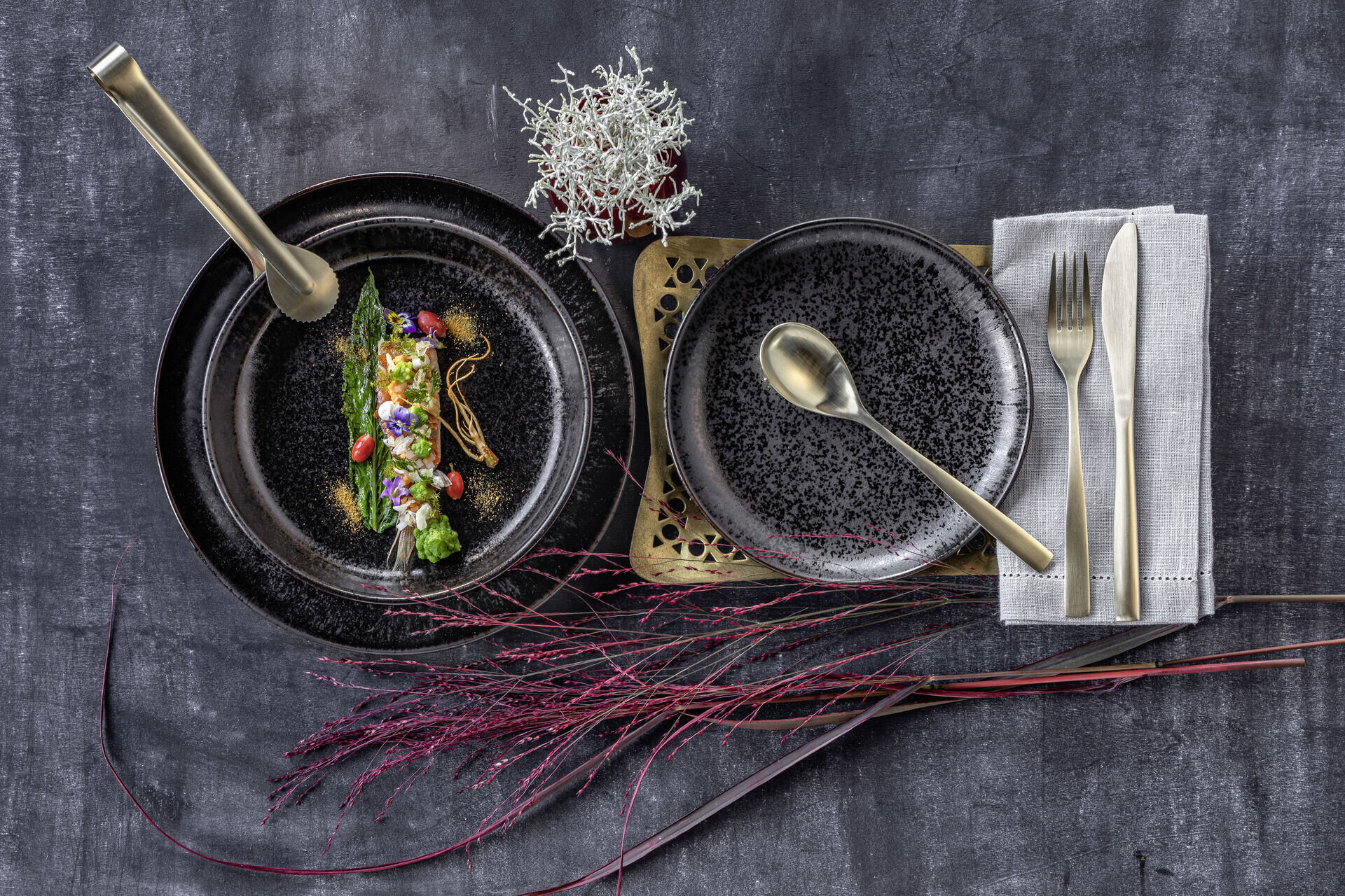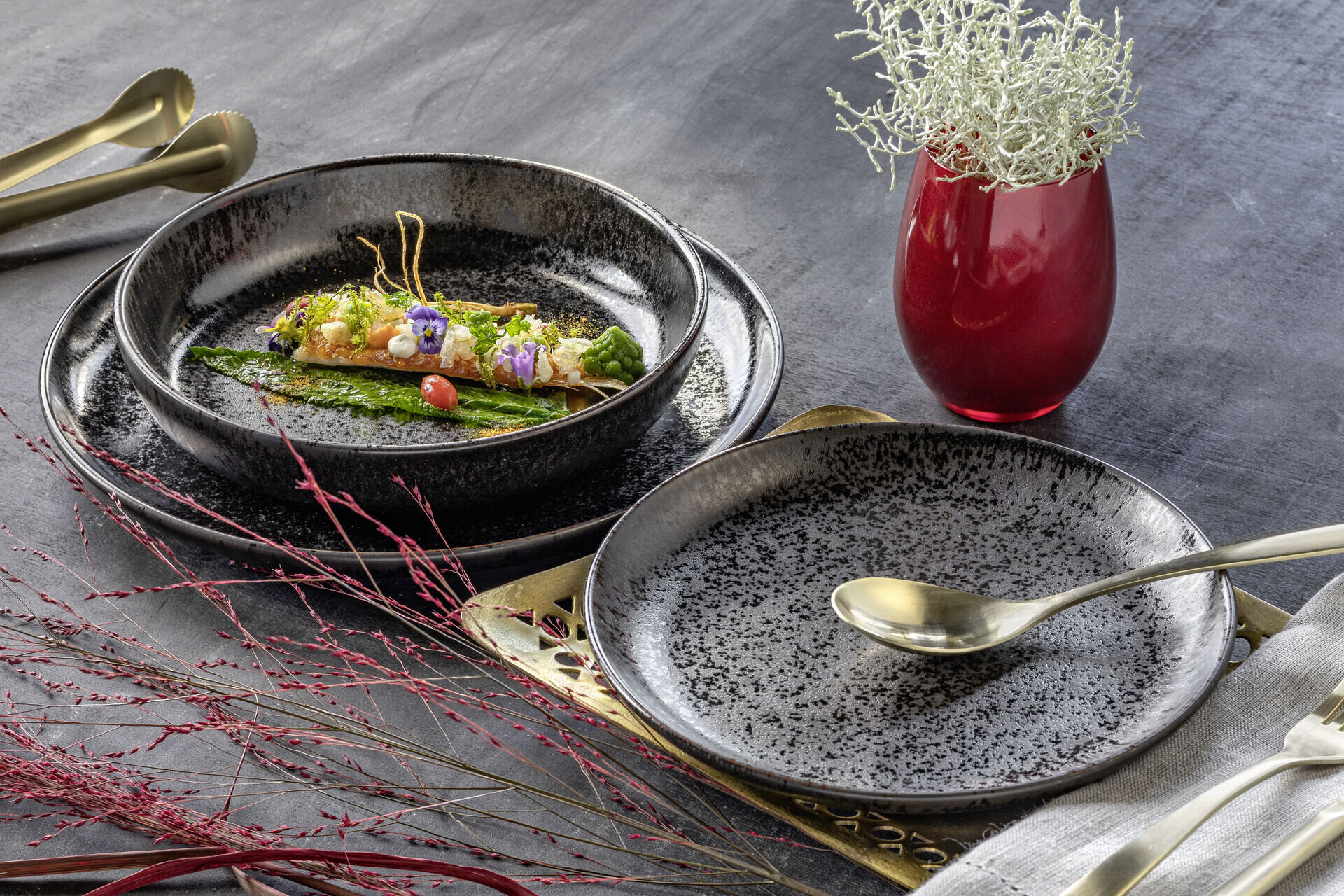 Porzellan. Farbe schwarz. Die Besonderheit dieser Serie basiert nicht nur auf der Trendfarbe schwarz und der Form, sondern auch auf der optischen Struktur, welche durch das unregelmäßige Muster erzeugt wird und jedes Stück einzigartig erscheinen lässt. Mischsortierung. Spülmaschinengeeignet.