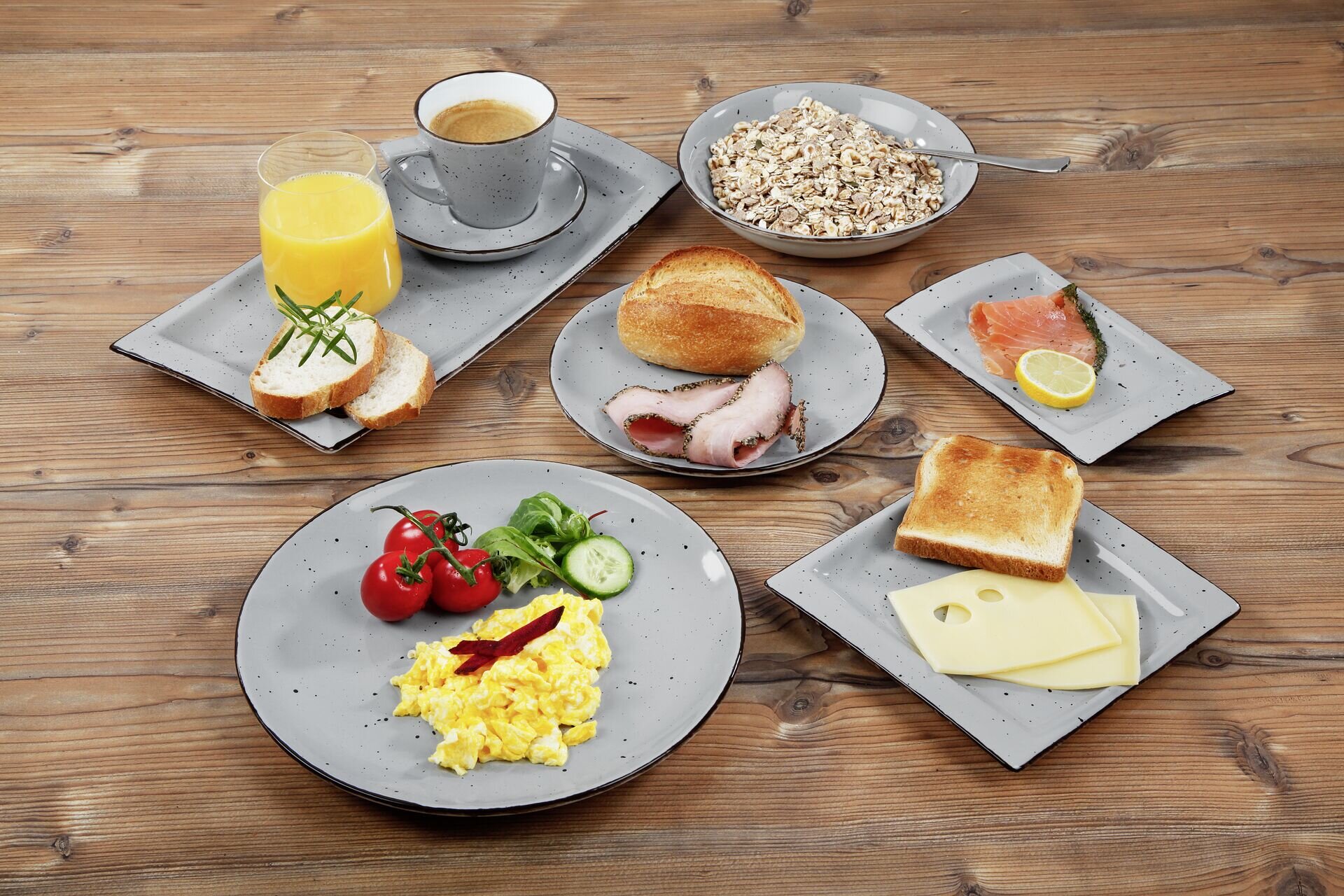 Porzellan. Grundfarbe grau (Farbverlauf bewusst unregelmäßig), Rand braun und Spiegel braun gesprenkelt. Mischsortierung. Spülmaschinengeeignet.