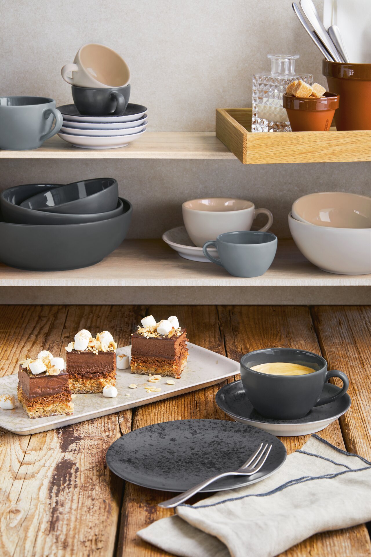 Lebendige natürliche Steinstruktur, Ton-in-Ton von sanftem Beige bis zu intensivem Anthrazit! Das ist die BAUSCHER sandstone Geschirr Kollektion.