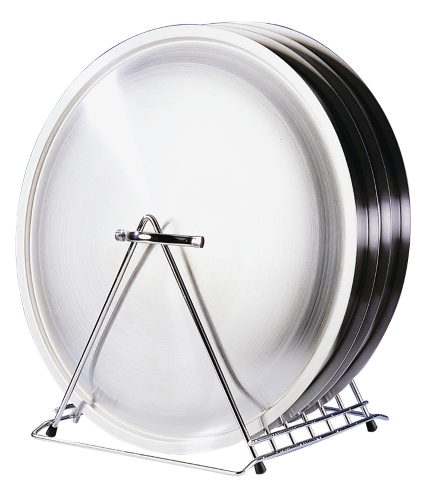 LxBxH in cm: 26,5x23,5x28 Edelstahl 18/10. 6 Fächer für Schneidbretter oder Deckel bis 2,8 cm Stärke.