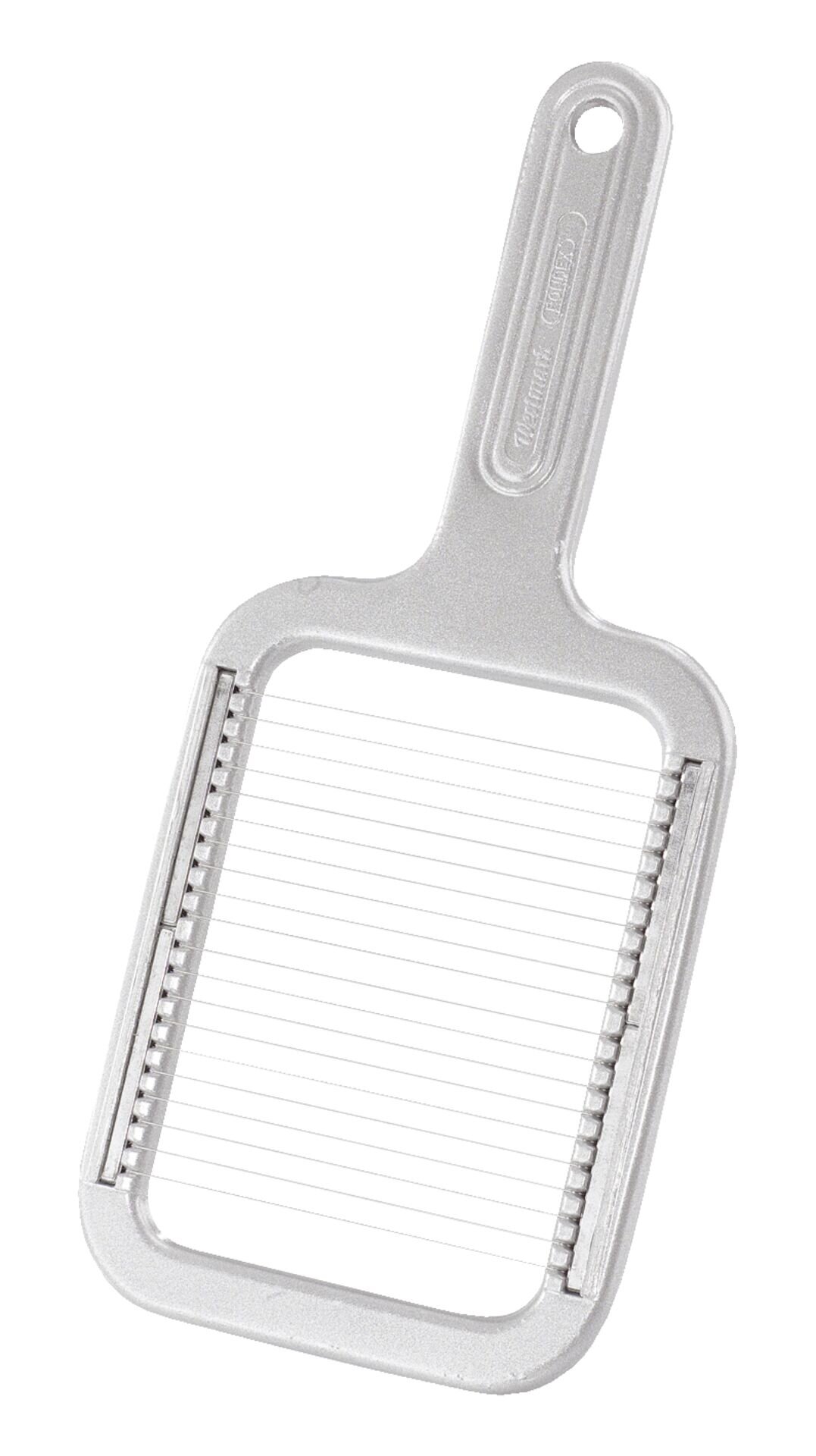 Aluminium beschichtet, Edelstahl-Schneiddrähte. Schneidet gekochte Karfoffeln schnell in gleichmäßige Scheiben. Auch für Eier, Mozzarella, gekochten Sellerie, Rote Beete, etc. Mit lebensmittelechter Spezialbeschichtung. Nicht spülmaschinengeeignet.