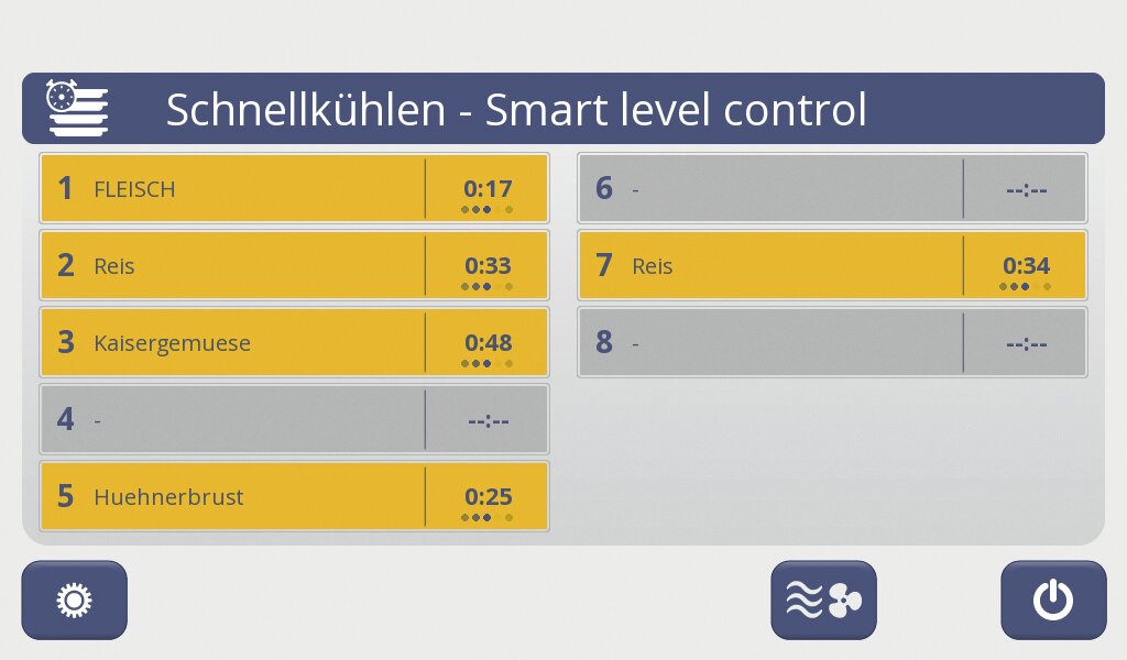 Am Display wird in Echtzeit kontinuierlich der Temperaturverlauf der zu kühlenden Speisen und die Endzeit (in Echtzeit) angezeigt.