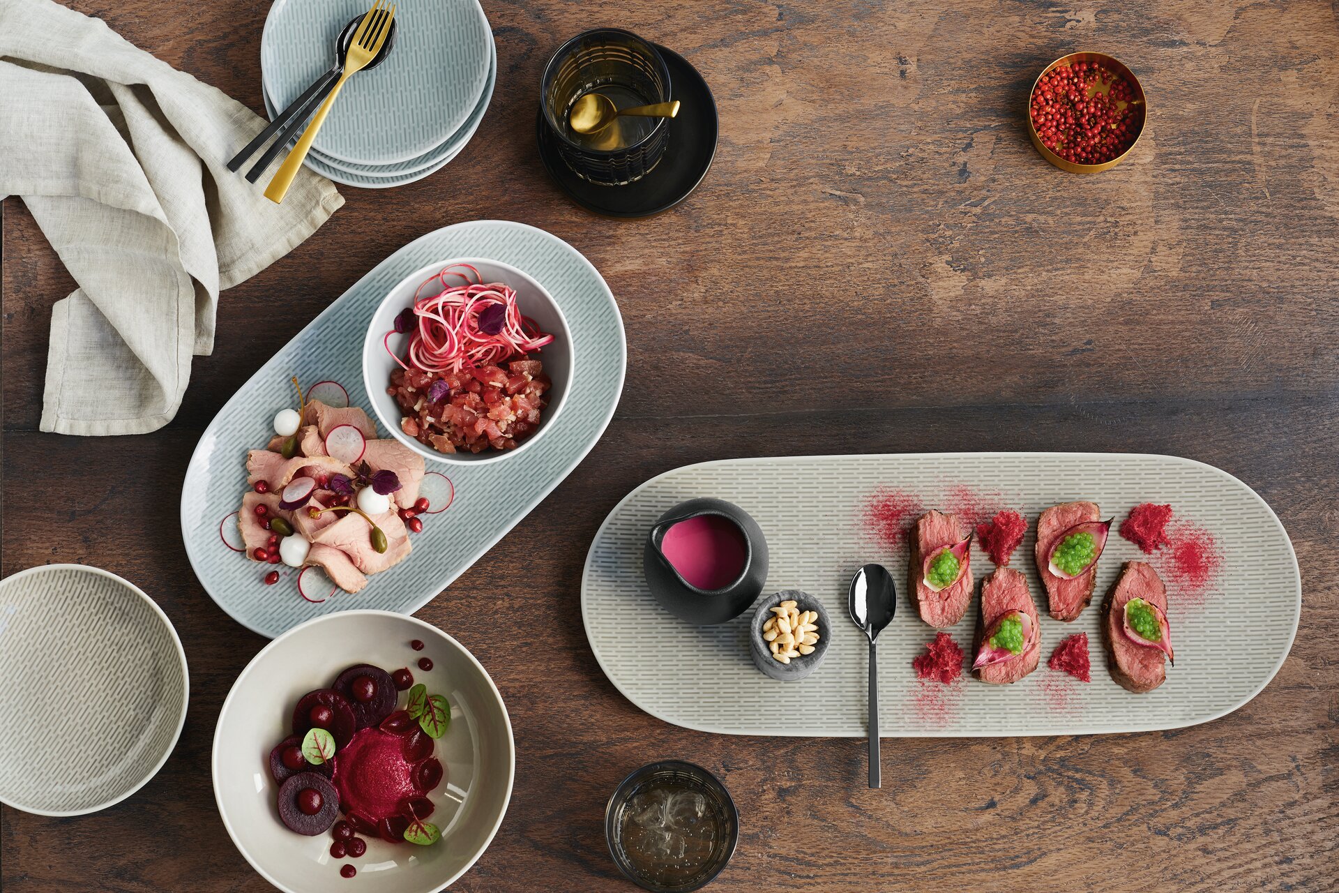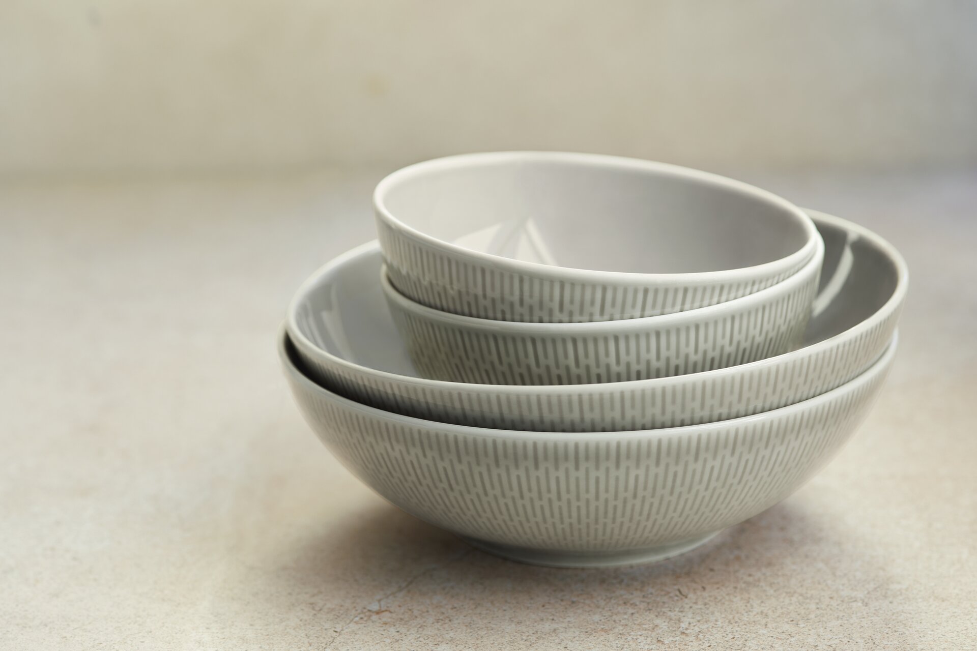 Das Design von SCOPE ist klar und dadurch äußerst vielseitig einsetzbar. Neben glatten und strukturierten Tellern, Bowls, Schalen und Platten in reinem Weiß umfasst das Sortiment auch Artikel in den Glasurfarben GLOW GRAY und SEA. Die Farbintensität variiert bei jedem Stück leicht, was den handgefertigten Charakter der Kollektion betont.