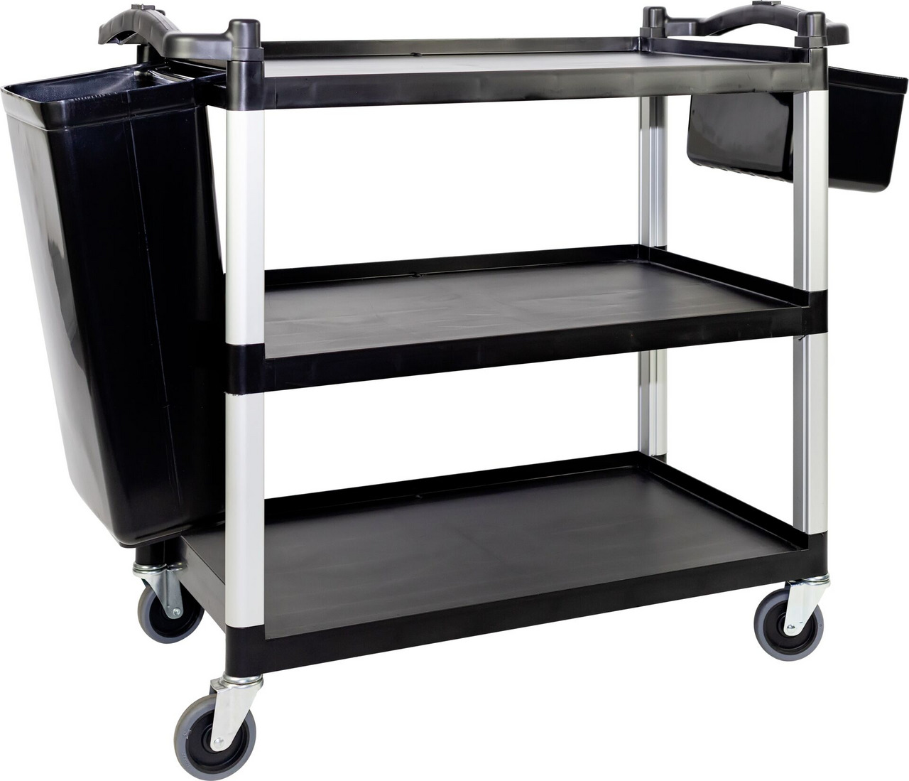 Ausführung: mit 3 Borden LxBxH in cm: 100x49,5x92 Preiswerter, robuster Servierwagen in Farbe schwarz/grau. Mit 3 Böden aus PP und Gestell aus eloxiertem Aluminium. 4 Lenkrollen, davon 2 mit Feststellbremse. Traglast gesamt 120kg/40kg pro Bord. Bordgröße: L: 78cm B: 48cm. Abstand zwischen den Borden: 30,5cm. Lieferung erfolgt zerlegt, Montage mittels beigefügtem Gummihammer. Besteck- und Abfallbehälter, schwarz aus PP, nicht im Lieferumfang enthalten, bitte separat bestellen.