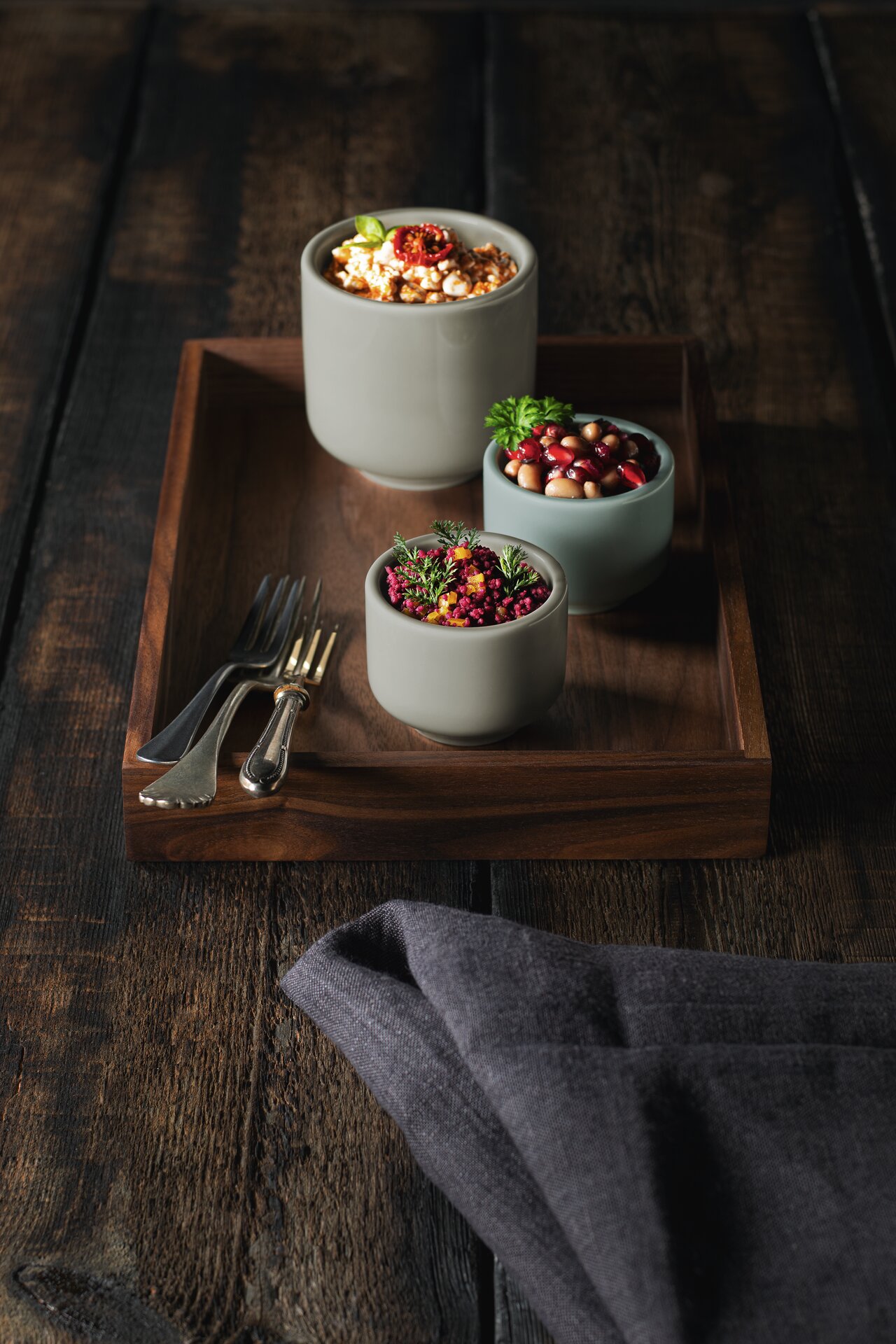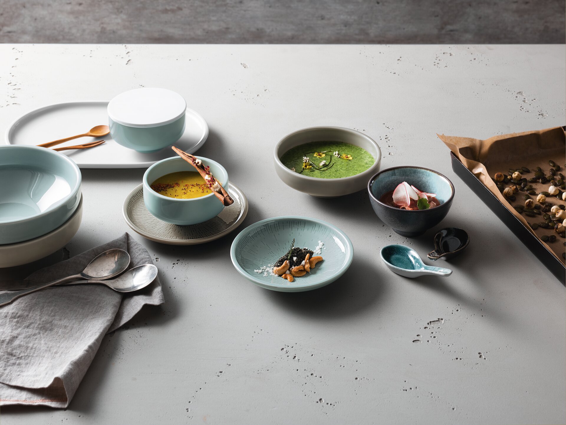 SHIRO GLAZE gibt dem kühlen, skandinavischen Design der Form einen emotionalen Touch. Durch den von Artikel zu Artikel wechselnden, leicht wolkigen Charakter der Farbglasuren entsteht eine lebhafte handwerkliche Optik. Die pastelligen Farbnuancen FROST und STEAM harmonieren bestens miteinander. Reizvolle Kontraste bringt das Zusammenspiel von reliefierten mit glatten Teilen ins Spiel.
