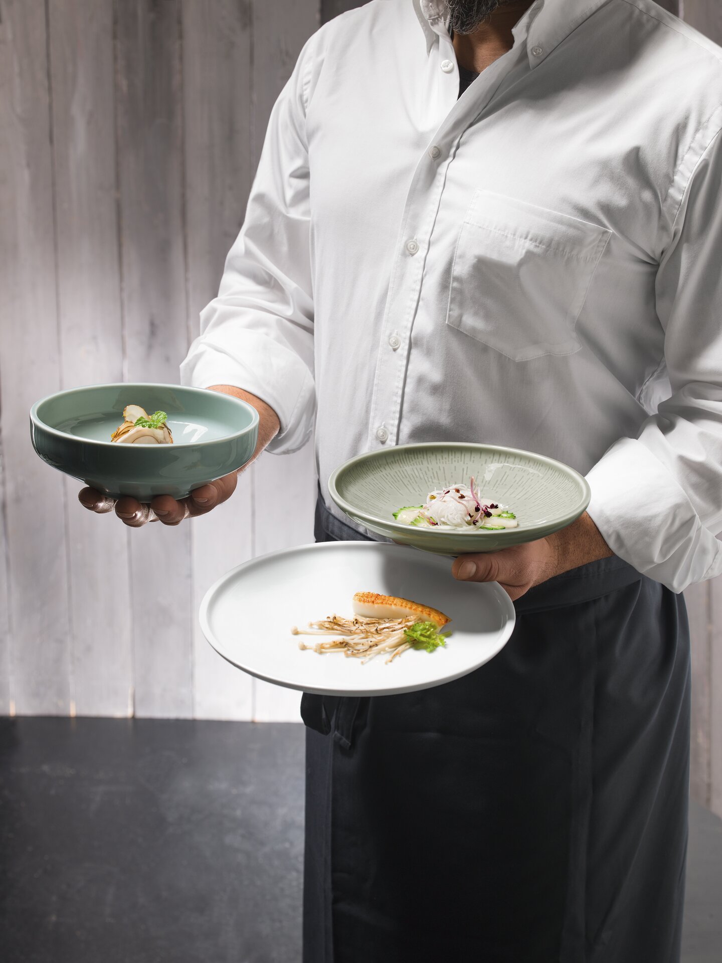 SHIRO GLAZE gibt dem kühlen, skandinavischen Design der Form einen emotionalen Touch. Durch den von Artikel zu Artikel wechselnden, leicht wolkigen Charakter der Farbglasuren entsteht eine lebhafte handwerkliche Optik. Die pastelligen Farbnuancen FROST und STEAM harmonieren bestens miteinander. Reizvolle Kontraste bringt das Zusammenspiel von reliefierten mit glatten Teilen ins Spiel.