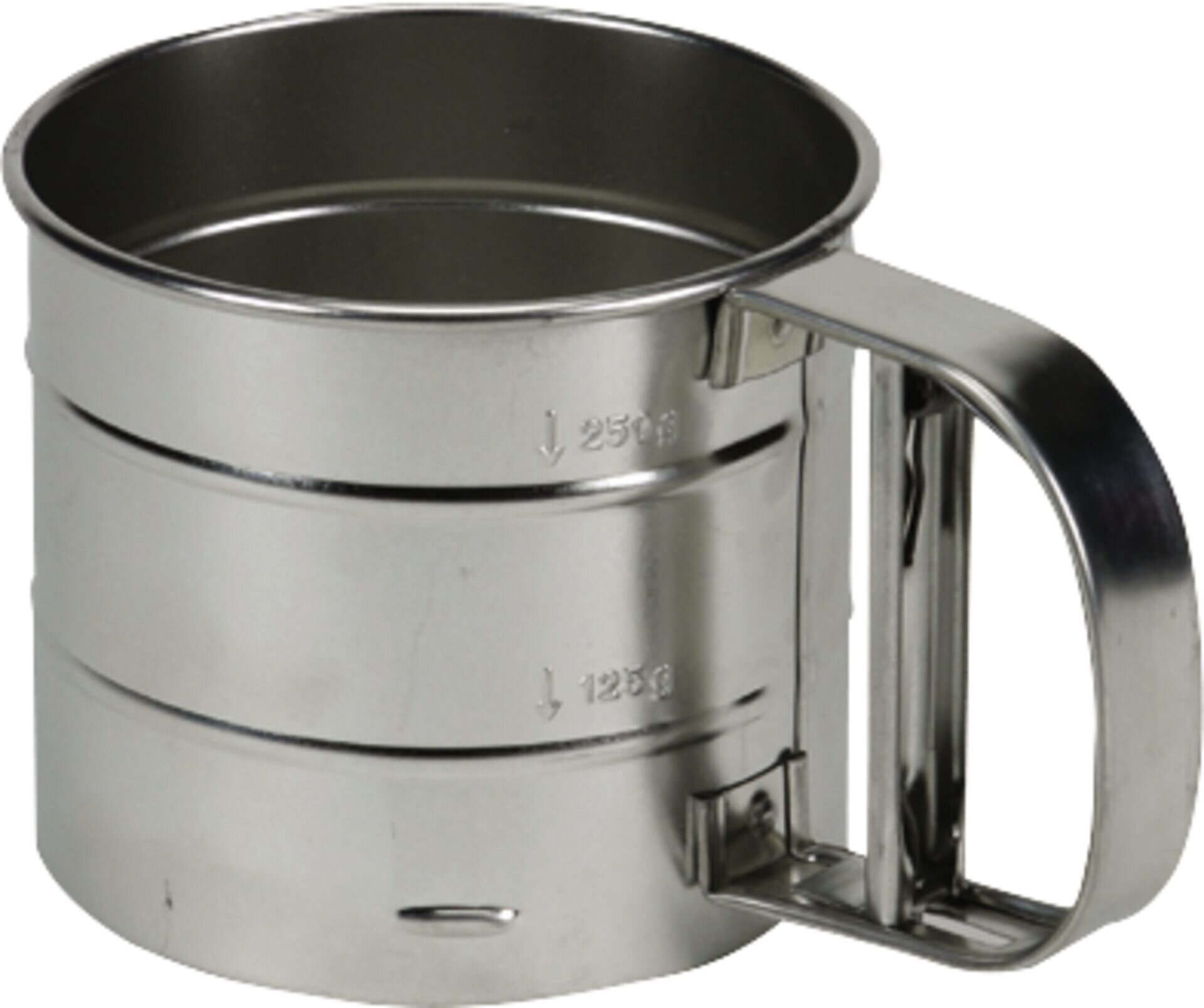 Ø in cm: 10 Edelstahl, mit Einhandmechanismus. Zum Beispiel für Puderzucker, Kakao oder Mehl.