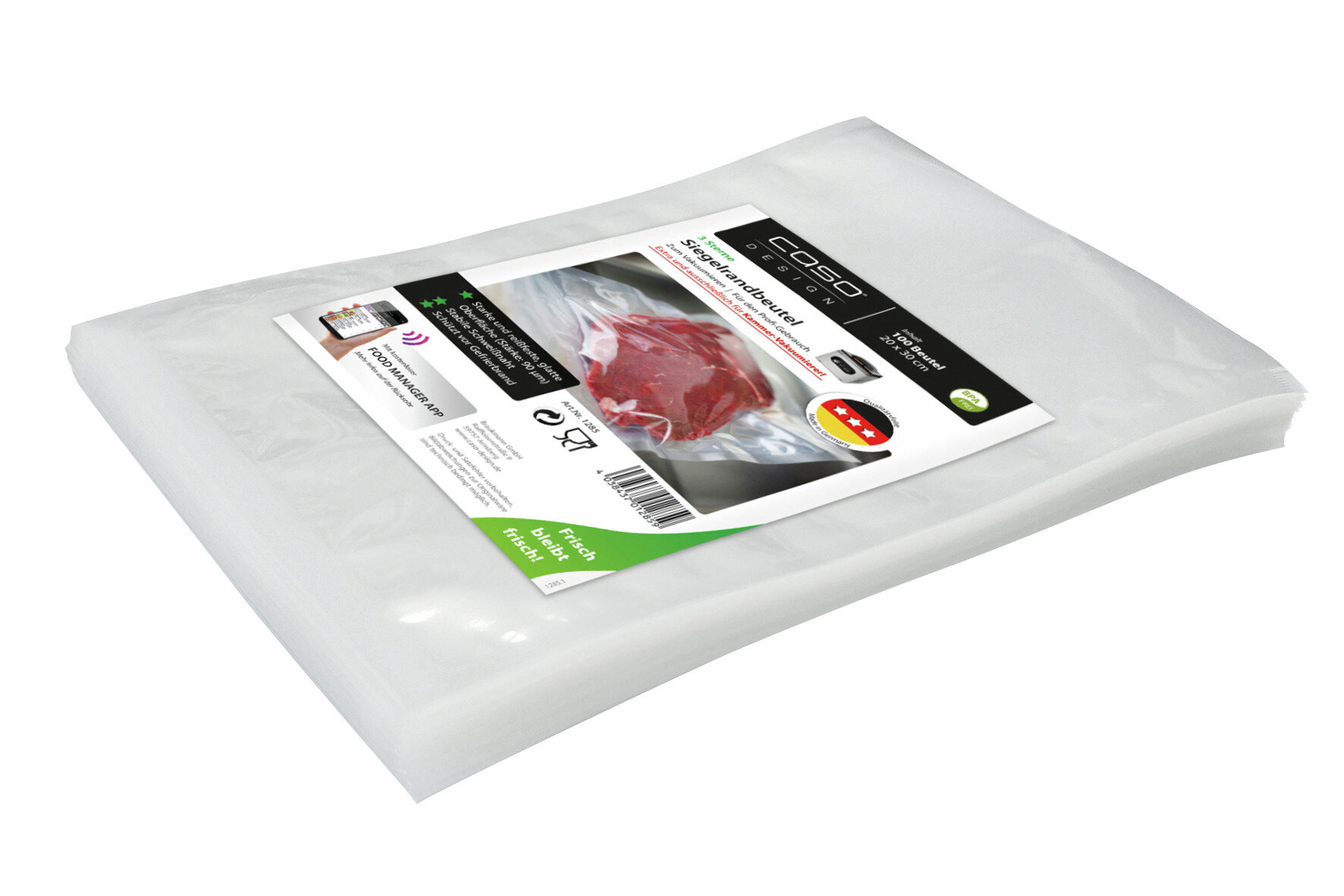 BPA-frei, Sous-Vide geeignet (kochfest bis 70°C für max. 2 Std. oder 100°C für max. 15 min.), schützt vor Gefrierbrand, glatte Oberfläche, nicht für Balkenvakuumierer geeignet. Passend für Artikel 17473 u. 17961.