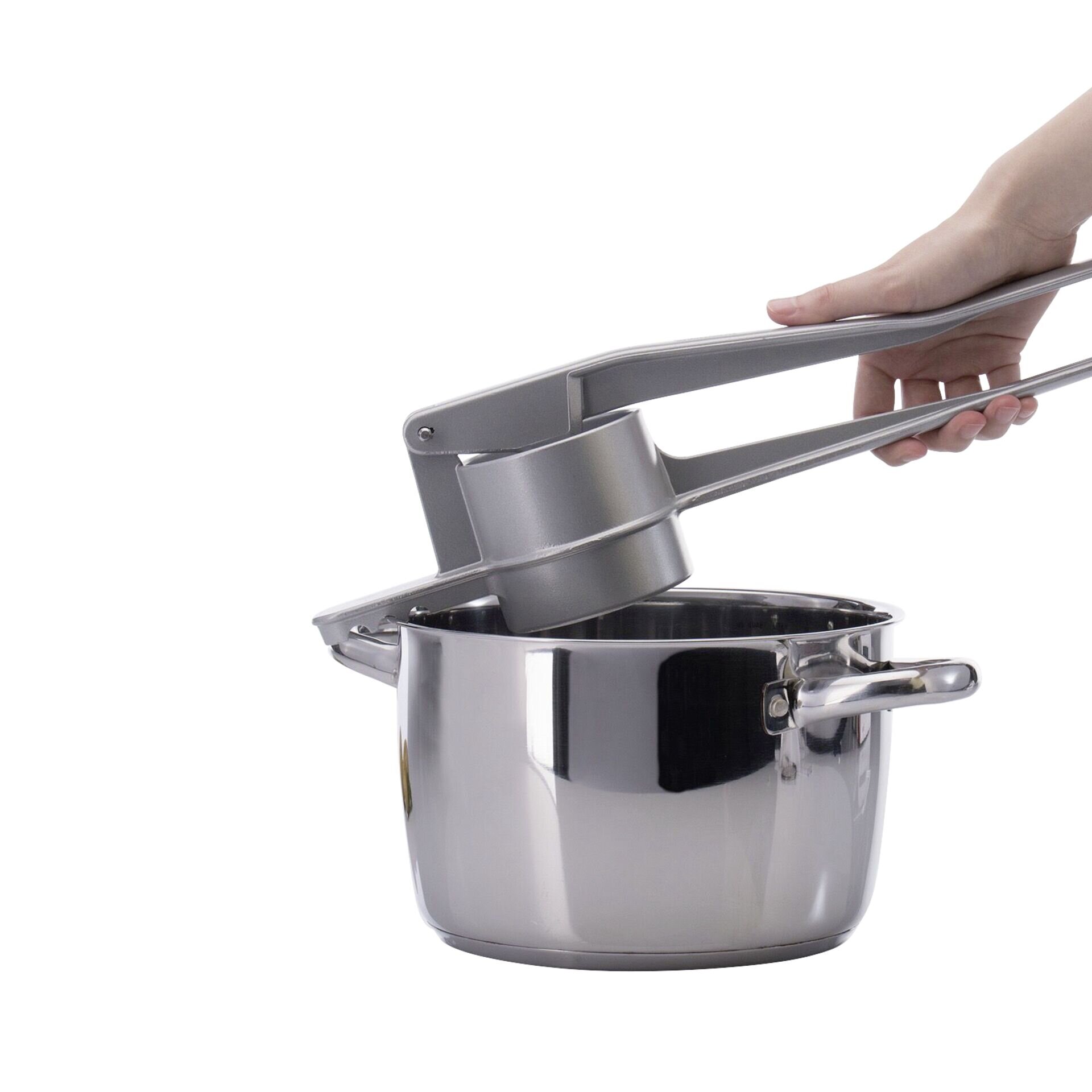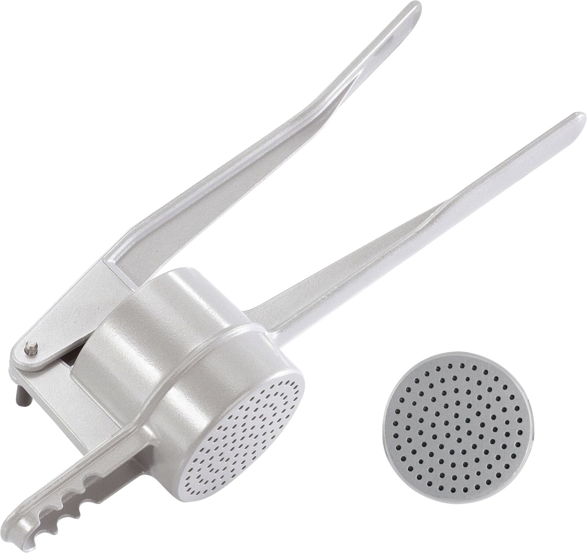 Aluminium beschichtet, ideal für die Zubereitung von Kartoffelpüree, Obstsäften, Spaghetti-Eis etc. der Griff ist unten abgeflacht und bietet mit den drei Auflagerasten vorne sicheren Halt auf verschieden großen Töpfen, spülmaschinengeeignet.
