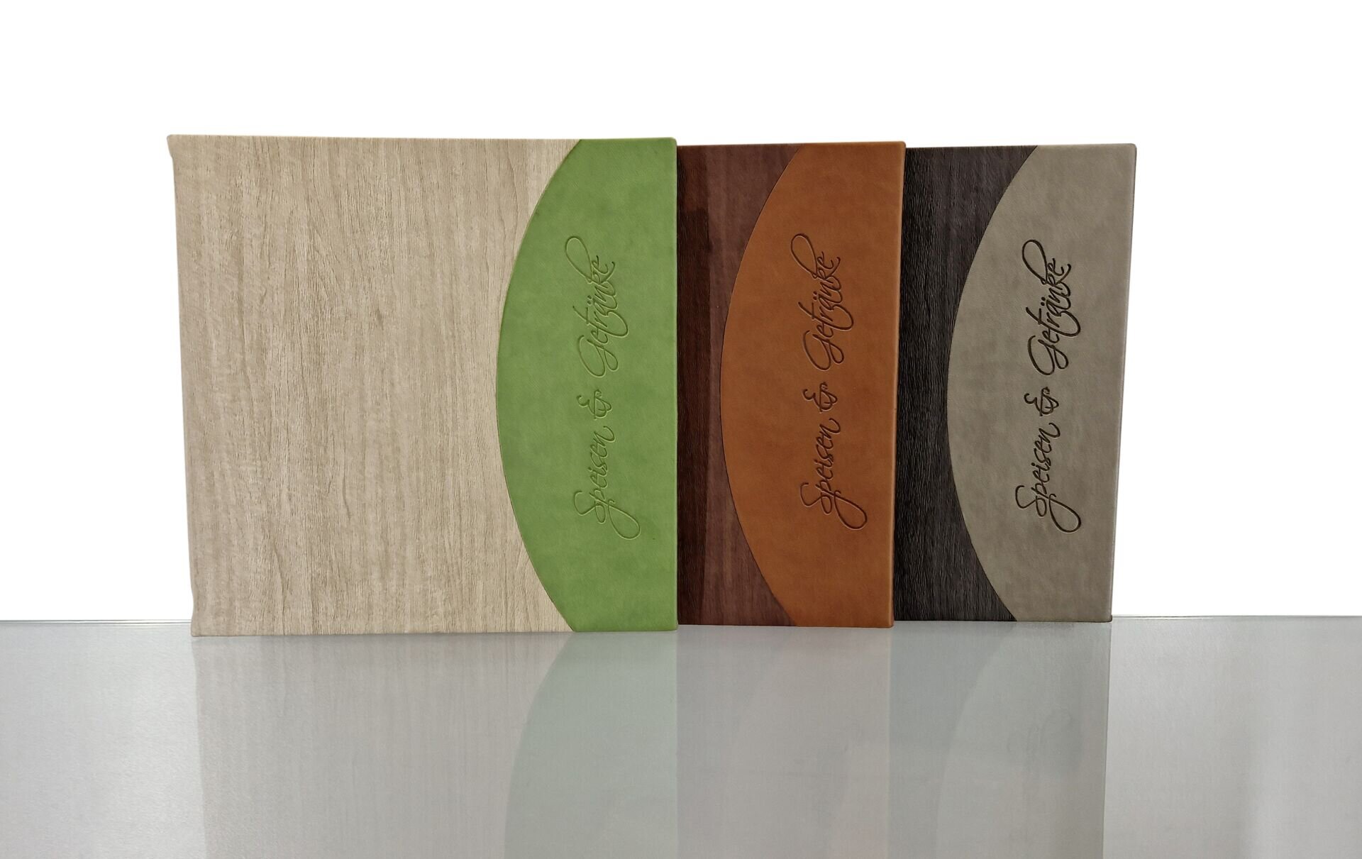 Kunstleder. LxB in cm: 23x22. Mit Gummiband und doppelseitiger Transparenthülle. Farbe: white wash + grün