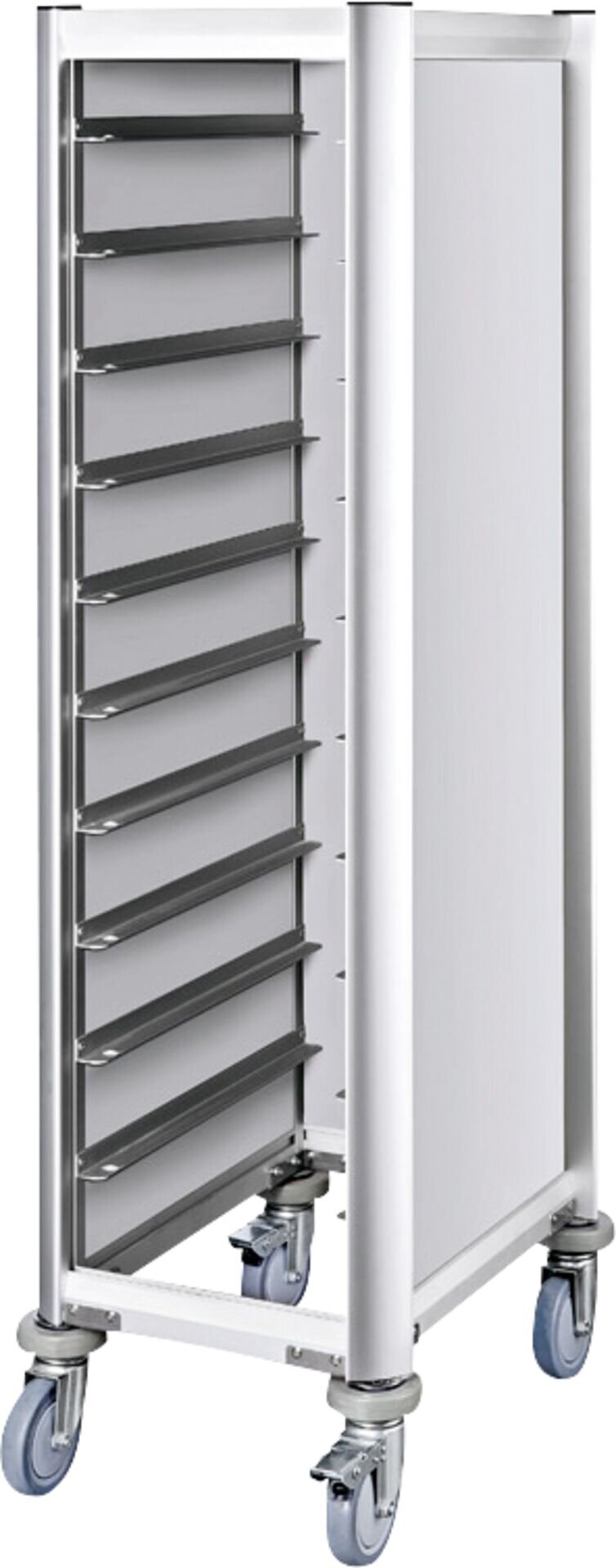 Alu-Profile mit MDF-Platten Dekor Alu. Für Tabletts 1/1 GN. 4 Lenkräder Ø 12,5cm, 2 Räder mit Bremse.