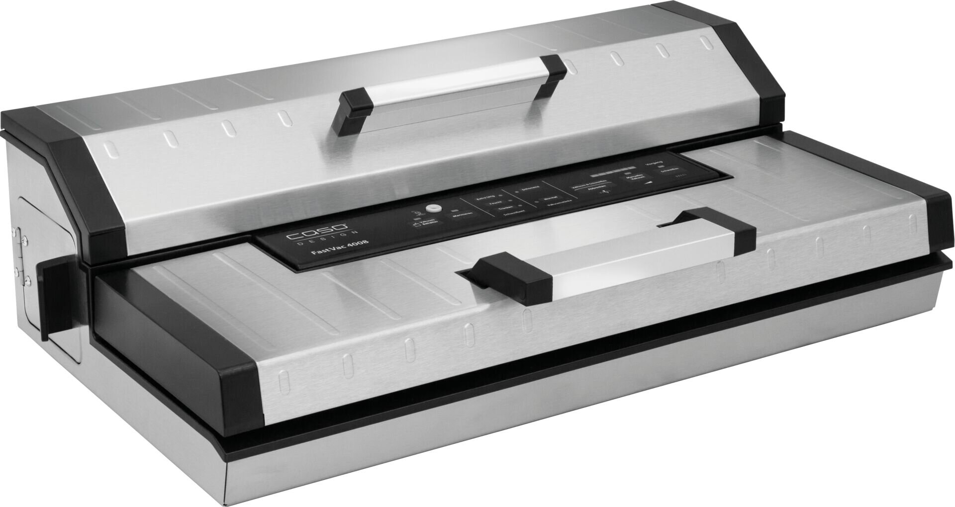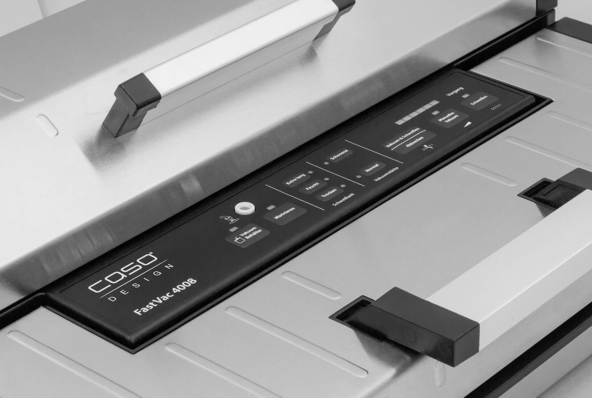 Komplett aus Edelstahl. Starke Vakuumpumpe 20L/Min. Max. Vakuum bis zu 0,9 Bar. Sichere Versiegelung mit doppelter Schweißnaht-Breite 40 cm. Austauschbarer Schweißbalken. Mit ausklappbarem Cutter zum Zuschneiden der Folienrollen. Digitale Prozessanzeige. Regulierbare Schweißzeit. Regulierbare Vakuumstärke. Pulse-Funktion. Marinier-Funktion. Ink. 1 Profi-Folienrolle 40x600 cm, 10 Profi-Folienbeutel 20-30 cm und 10 Profi-Folienbeutel 30x40 cm. Passende Beutel u. Folien Art.-Nr. 143510, 143550, 17417, 17418, 17420 u. 17421.