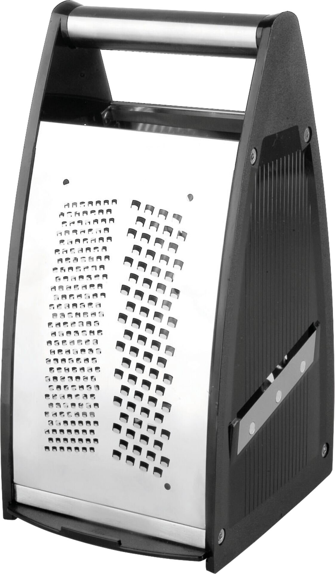 BxTxH in cm: 11x12,5x23 Edelstahl, Kunststoff, schwarz. Mit Griff. Vier Seiten mit verschiedenen Reiben. Spülmaschinengeeign…