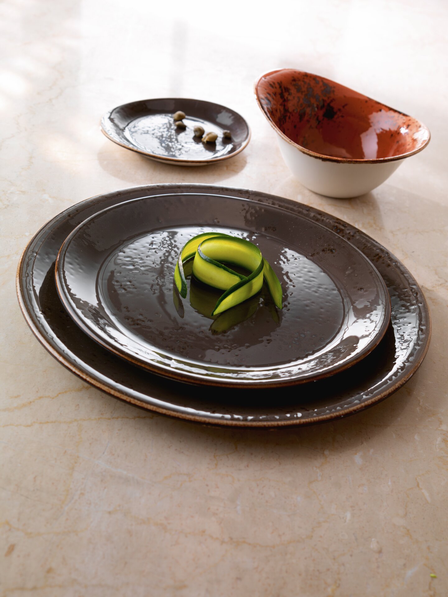 Craft ist inspiriert von handgearbeiteter, einfacher rustikaler Keramik, die von Generationen von Töpfern über Jahrhunderte hergestellt wurden. Das Sortiment verkörpert die Schönheit reicher, glänzender Glasuren, die von Hand aufgetragen werden, und zelebriert Zufallseffekte und Reaktionen, die auf natürliche Weise im Brennofen entstehen. Die edelsteinartigen Glasuren in Verbindung mit einfachen Formen und Formen erzeugen ein einzigartiges und individuelles Erscheinungsbild und verleihen Craft eine rustikale „Lebensfreude".